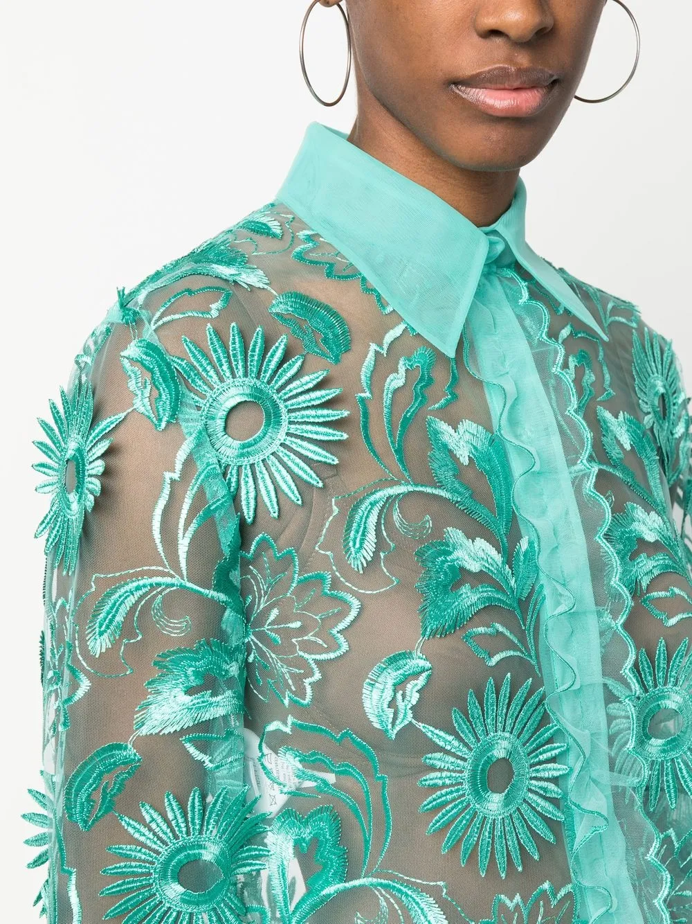Мятно-зеленый, вышивка, прямой воротник, потайная пуговичная застежка спереди, длинные рукава, манжеты на пуговицах и прямой подол.