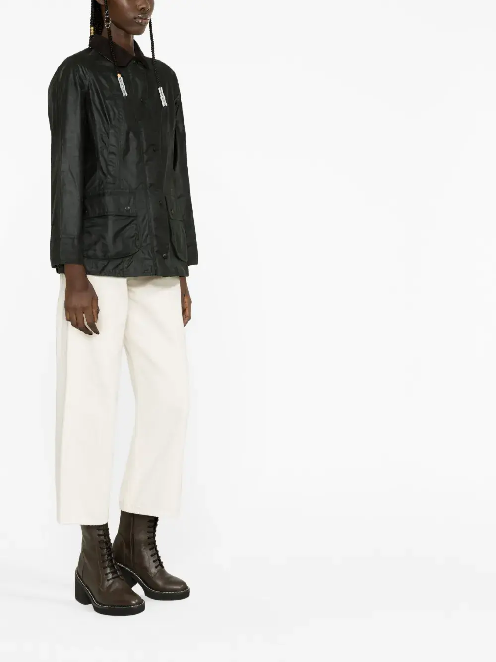 Черный, хлопок, вощеный материал, классический воротник, чехол с застежкой на кнопку, два кармана с клапанами по бокам и цельная подкладка.