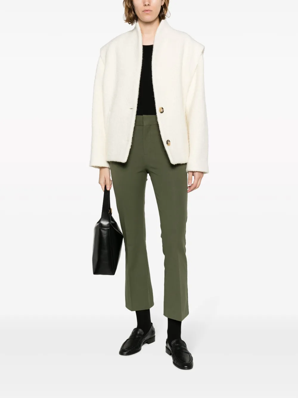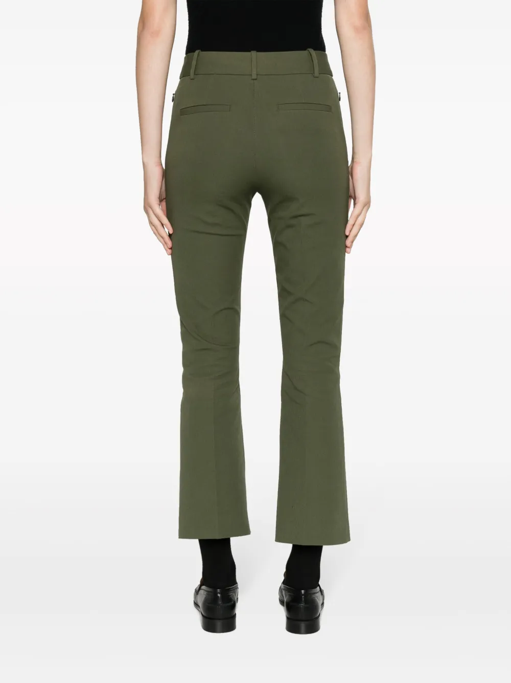 Зеленый, эластичный хлопок, петли для ремня, потайная застежка спереди, узкий крой, расклешенный крой, два вшитых кармана по бокам, два кармана с листочкой сзади и высота по щиколотку.