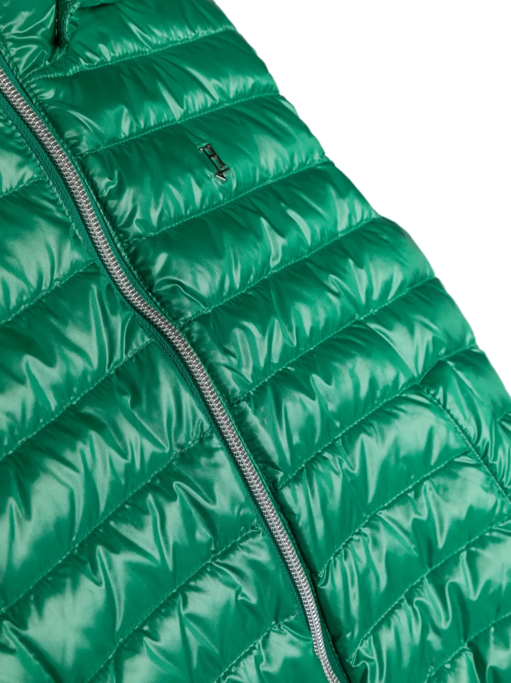Ярко-зеленый, гусиный пух, дутый материал, металлический логотип, классический капюшон, застежка на молнии спереди, без рукавов и два передних кармана с листочкой.