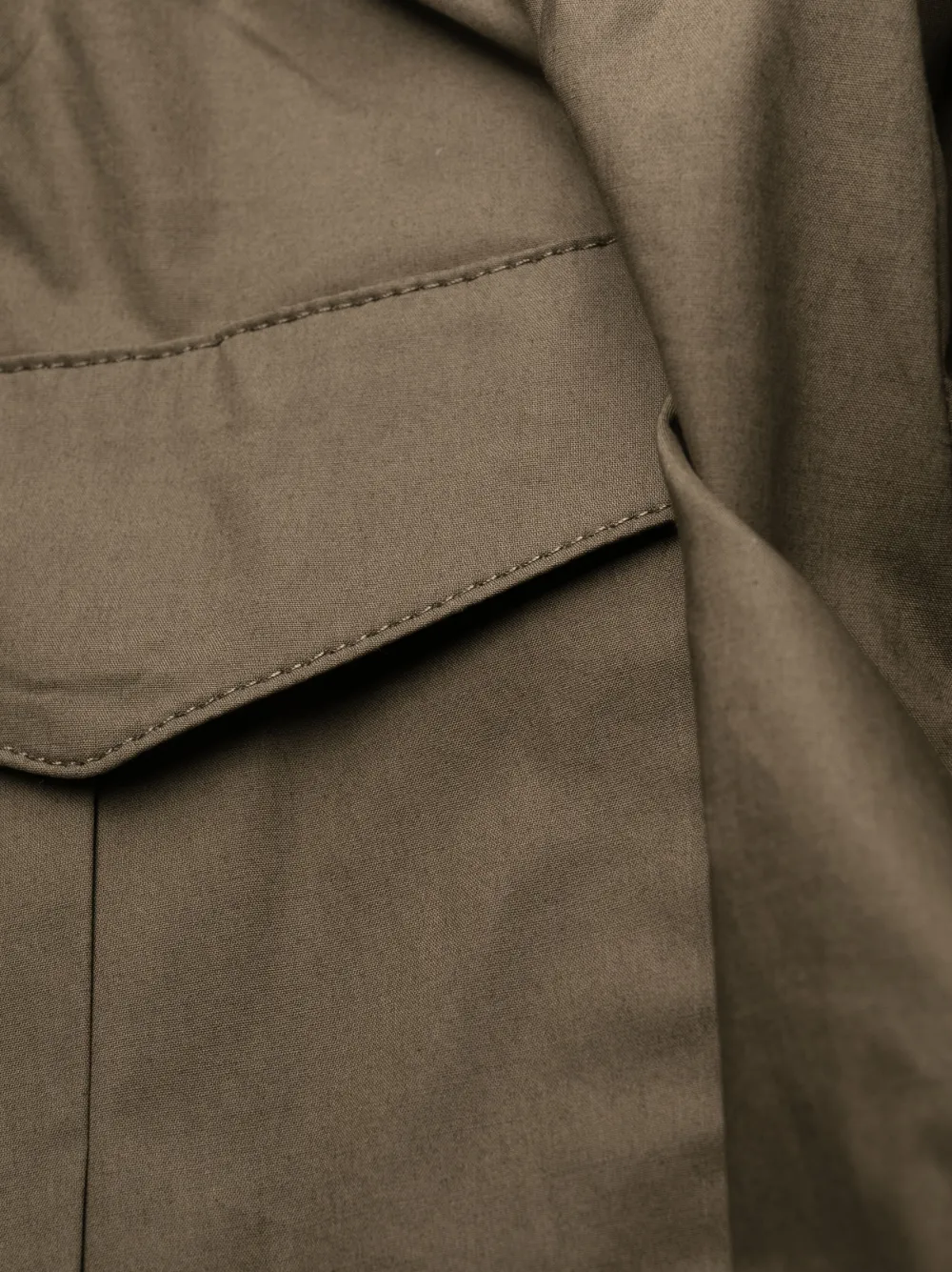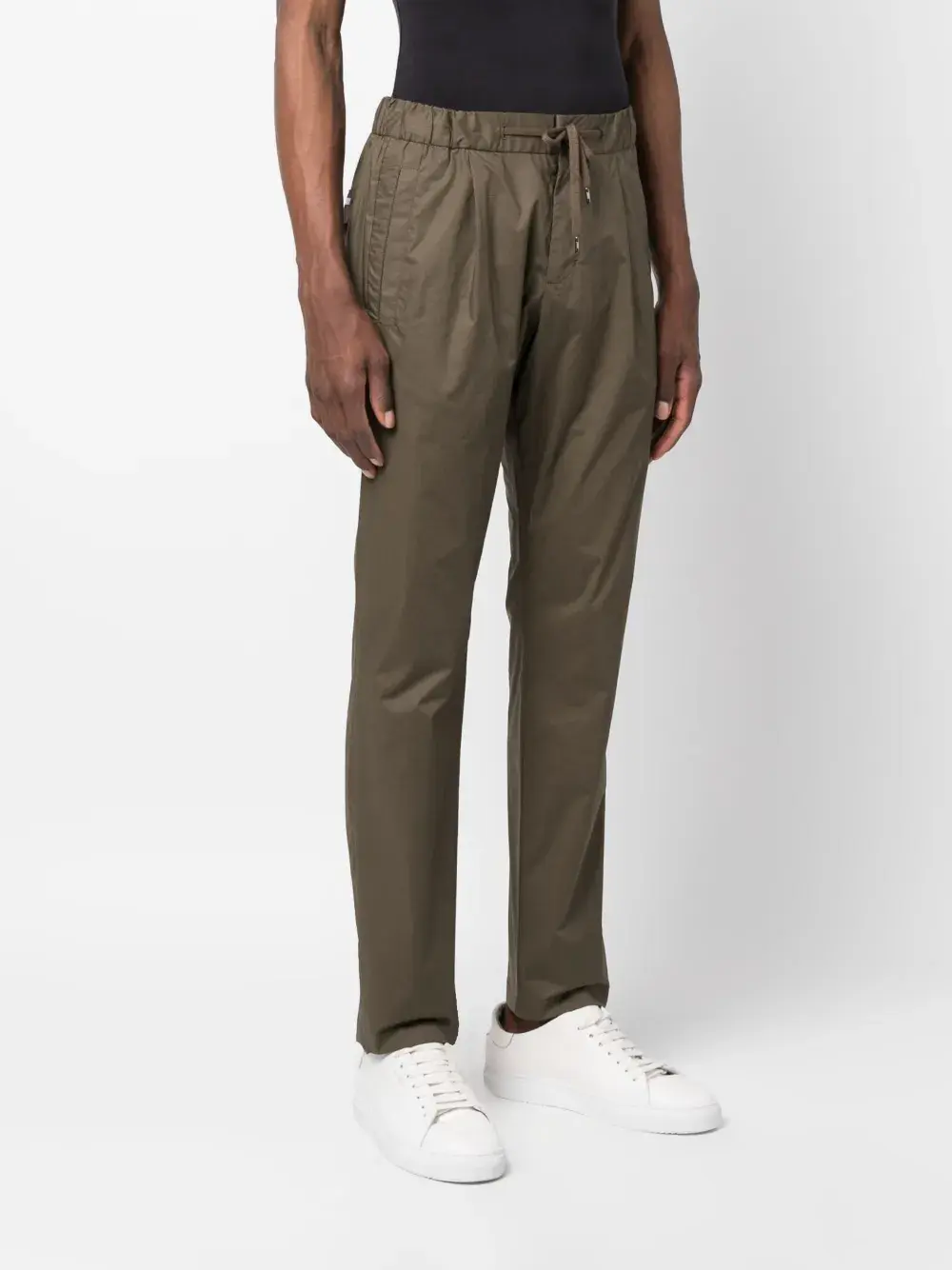 Хаки, эластичный хлопок, складки, прямой крой, кулиска на талии, застежка на молнии и пуговице спереди, два вшитых кармана по бокам и два кармана с клапанами сзади.