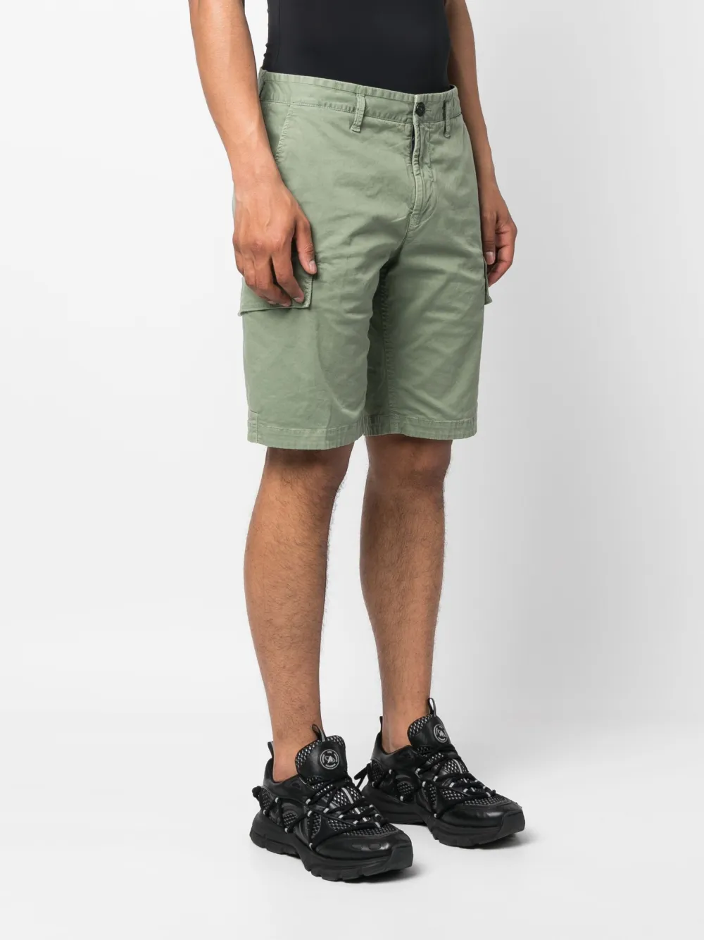 Светло-оливковый, эластичный хлопок, знаковая деталь в виде компаса, нашивка с логотипом сбоку, застежка на молнии и пуговице спереди, два вшитых кармана по бокам, два накладных кармана по бокам, задние карманы с листочкой и длина выше колена.