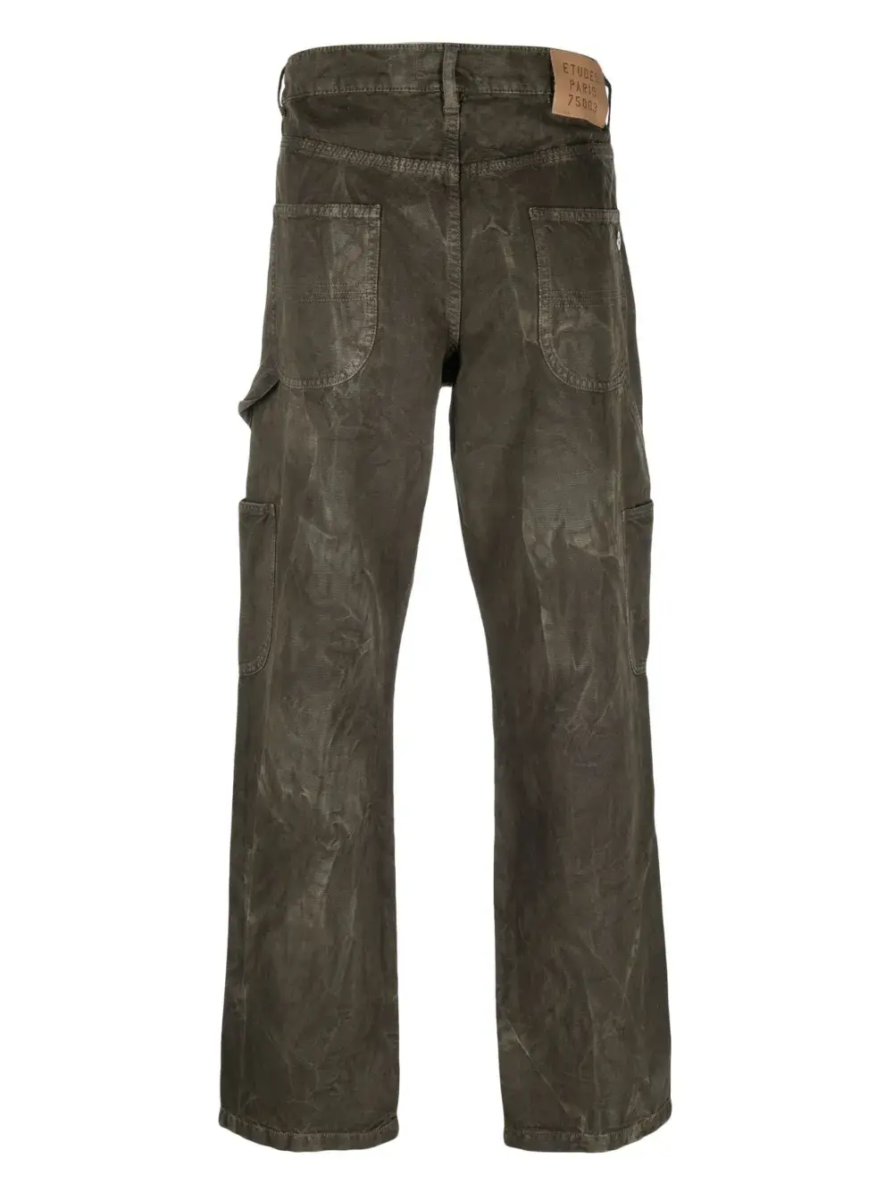 Коричневый, смесовый хлопок, окрашивание готовой вещи по технологии garment dye, двухслойный материал, люверсы, нашивка с логотипом сзади, заклепки, петли для ремня, крепление для ключей, застежка на молнии и пуговице спереди, два прорезных кармана по бокам и два накладных кармана по бокам.