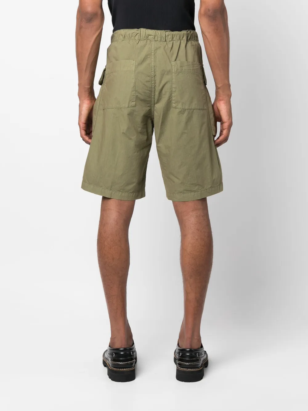Хаки, хлопок, стрелки, потайная застежка на молнии и пуговицах, эластичный пояс сзади, два накладных кармана по бокам, два накладных кармана сзади, прямой подол и прямой крой.