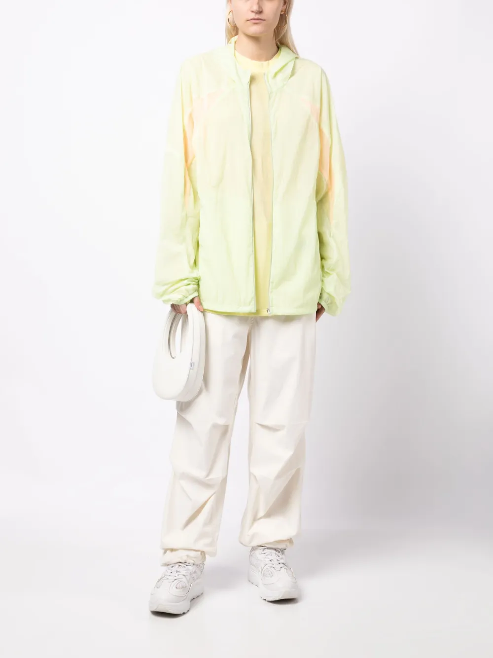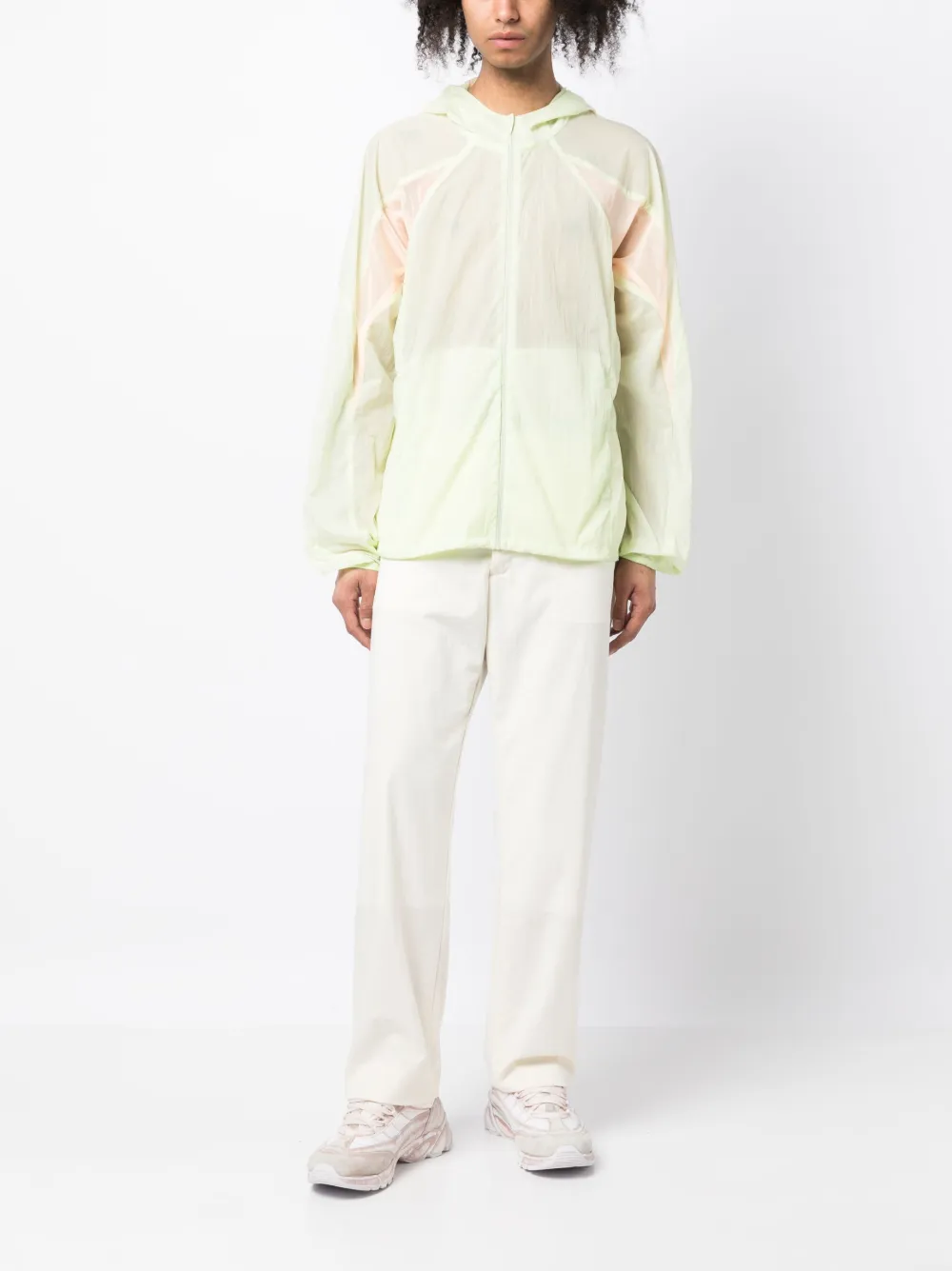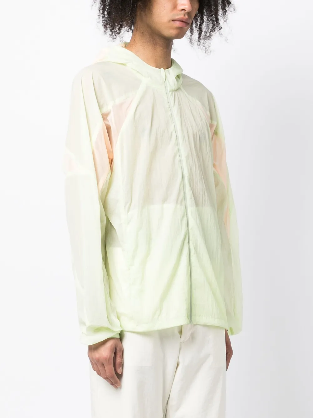 Светло-зеленый, светло-оранжевый, прозрачный материал, объемный капюшон, застежка на молнии спереди, два прорезных кармана по бокам, длинные рукава и прямой подол. Это унисекс-модель. Обратите внимание, что для нее используется мужская размерная сетка.