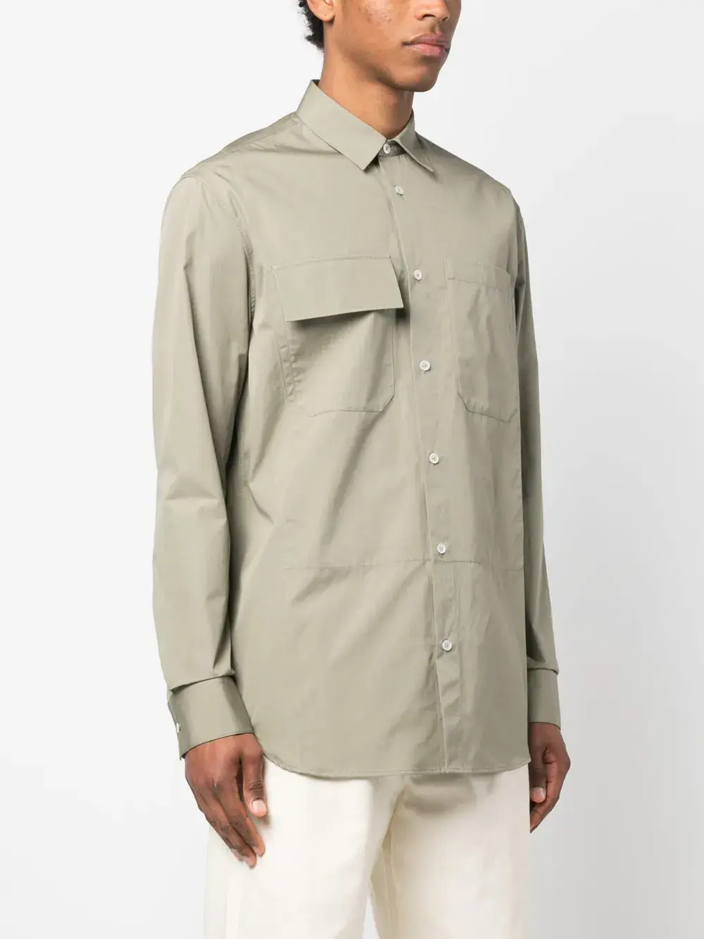 Серо-зеленый, хлопок, классический воротник, застежка на пуговицах спереди, длинные рукава, манжеты на пуговицах, нагрудный накладной карман, нагрудный карман с клапаном и закругленный подол.