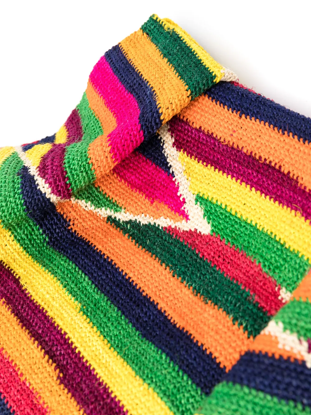 Разноцветный, геометричный узор, узор в горизонтальную полоску, трикотажный материал, детали с оборками, основное отделение и потайная застежка на молнии сверху.