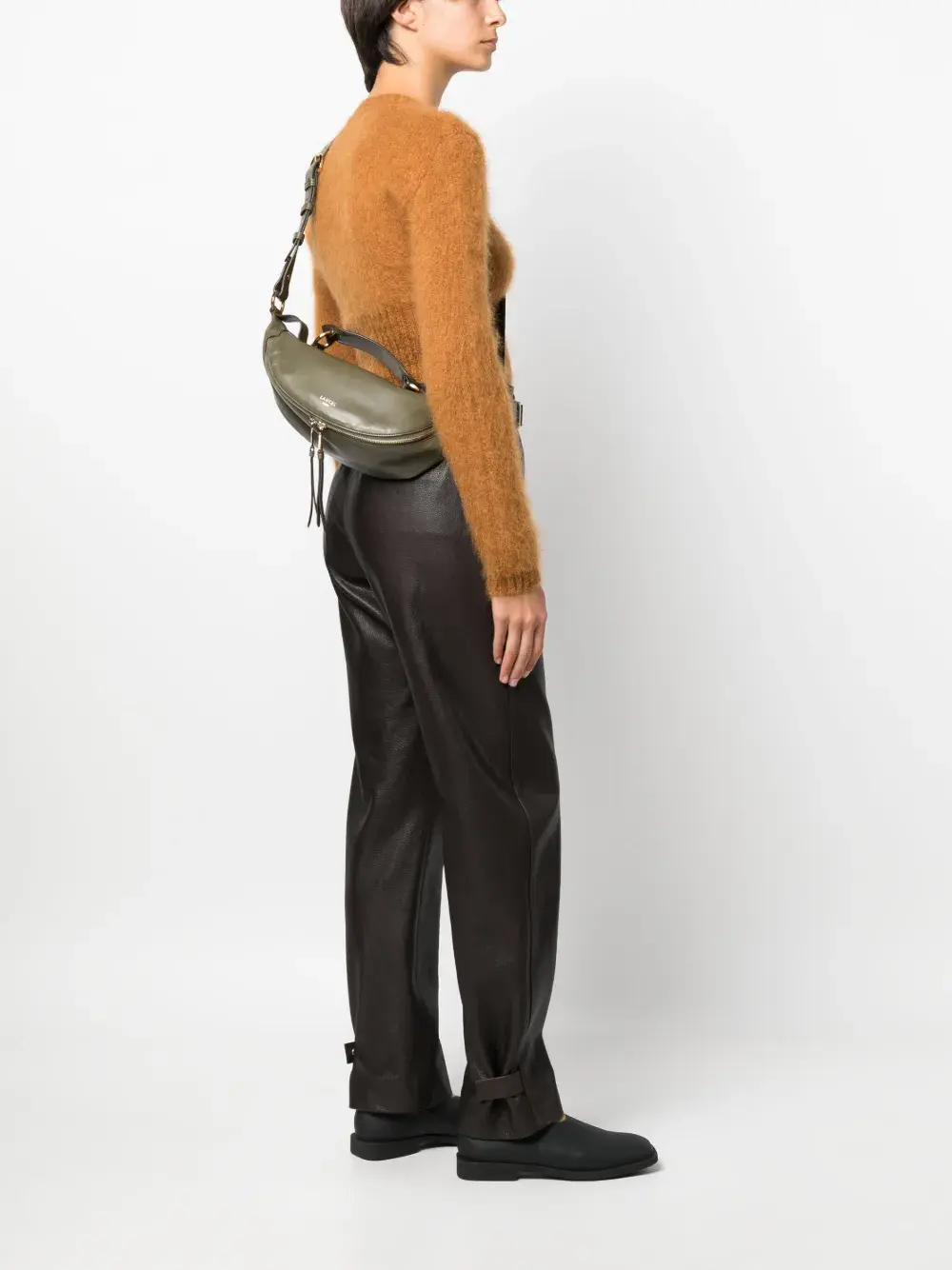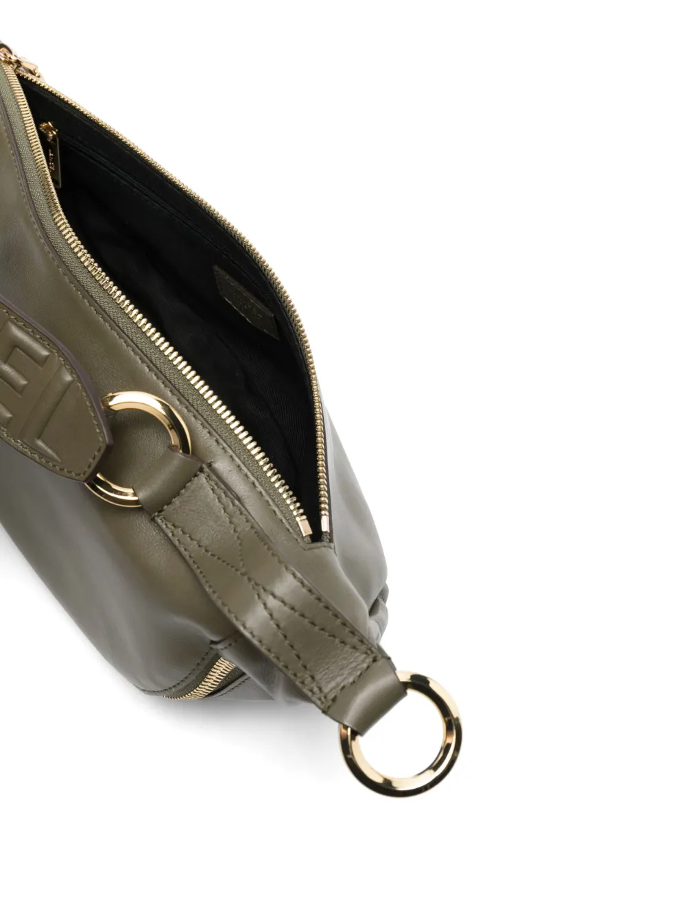 Хаки, кожа, тисненый логотип спереди, застежка с тисненым логотипом, верхняя ручка, карман на молнии сзади, съемный регулируемый ремень на плечо, застежка на молнии сверху и внутренний карман на молнии.