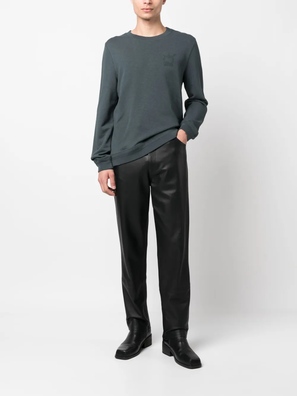 Темно-зеленый, хлопок, принт с изображением черепа спереди, круглый вырез, длинные рукава и прямой подол.