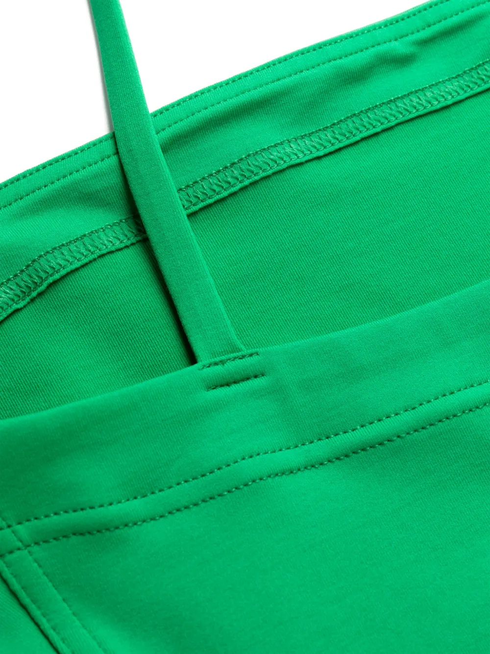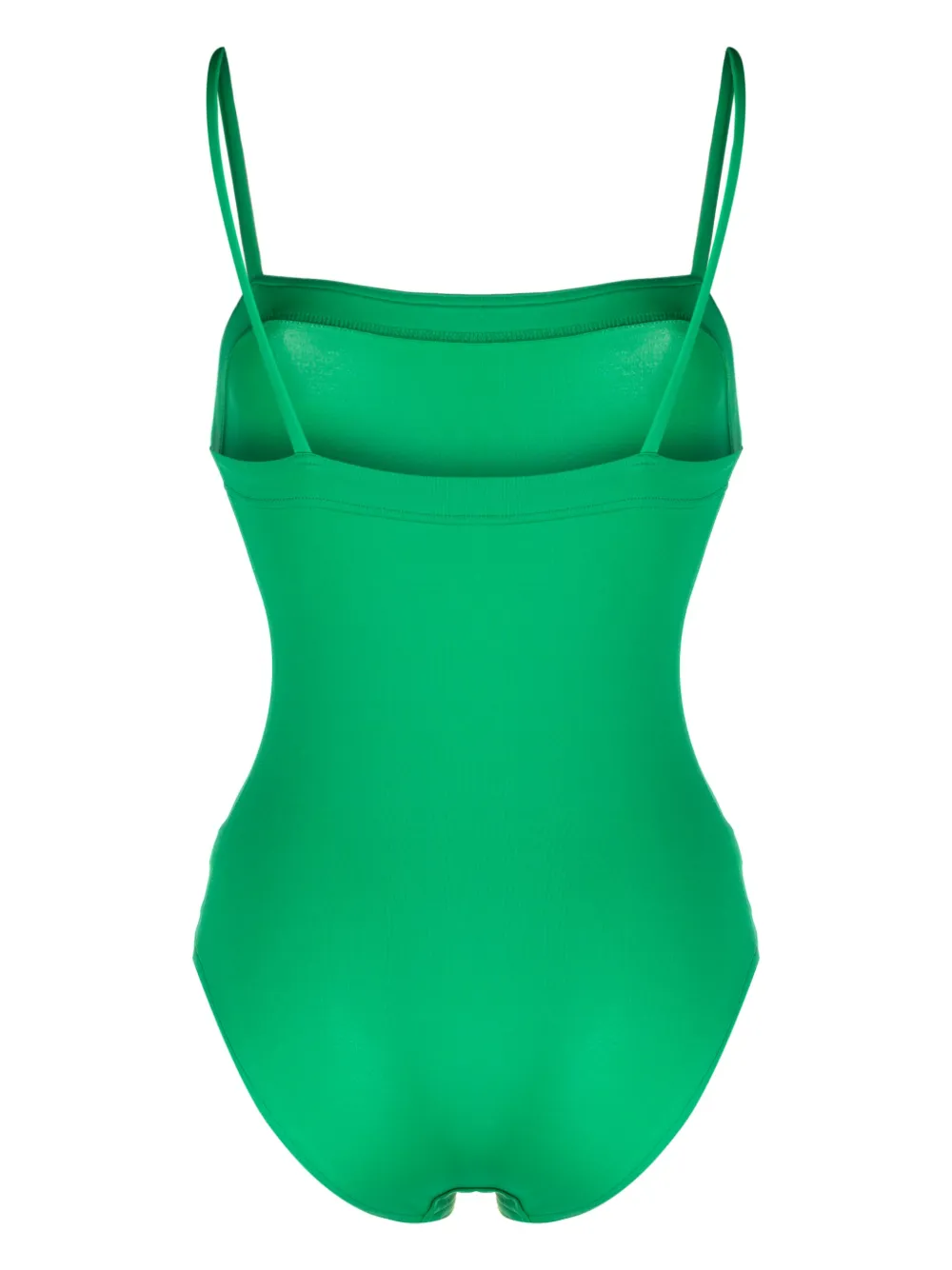 Зеленый, эластичный материал, узкие бретели, квадратный вырез и без рукавов. Пожалуйста, примеряйте купальники и пляжные шорты только поверх собственного белья.