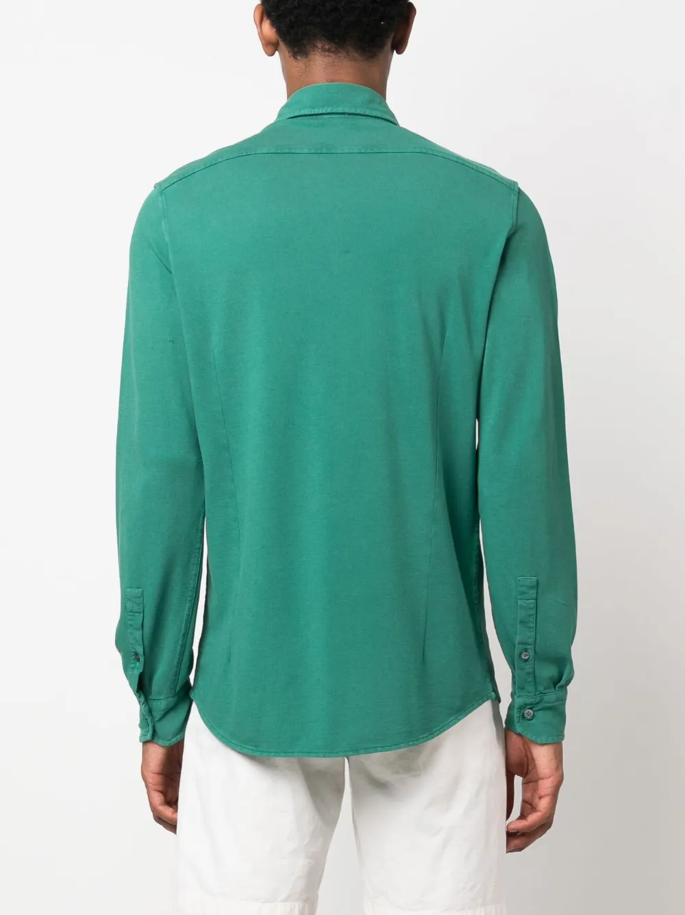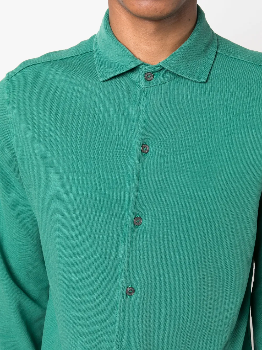 Насыщенный зеленый, хлопок, отложной воротник, застежка на пуговицах спереди, длинные рукава и закругленный подол.