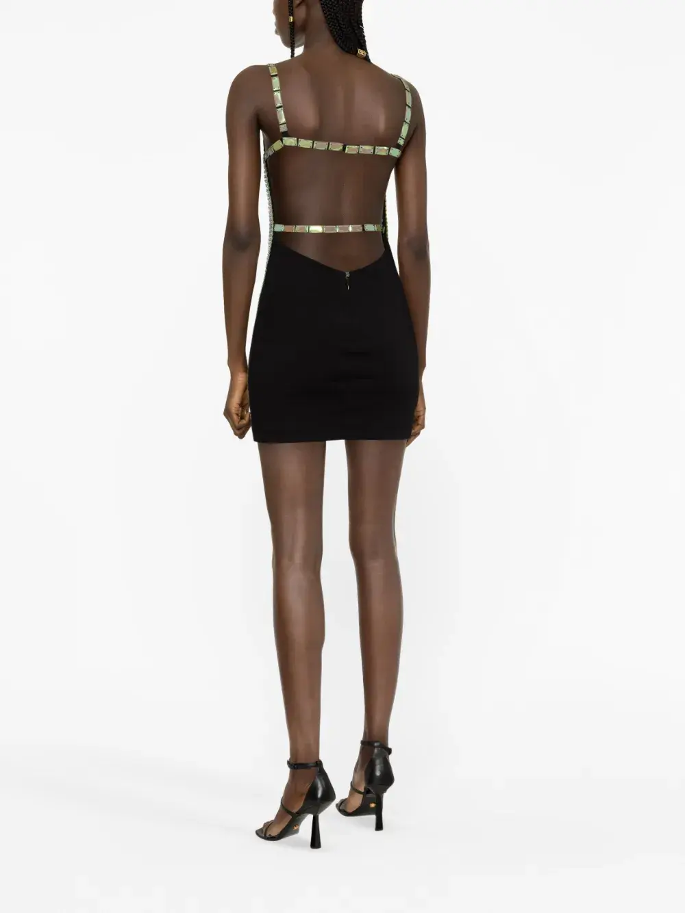 Покрытие с переливающимся эффектом, украшение из пайеток, открытая спина, тонкие бретели и потайная застежка на молнии сзади.