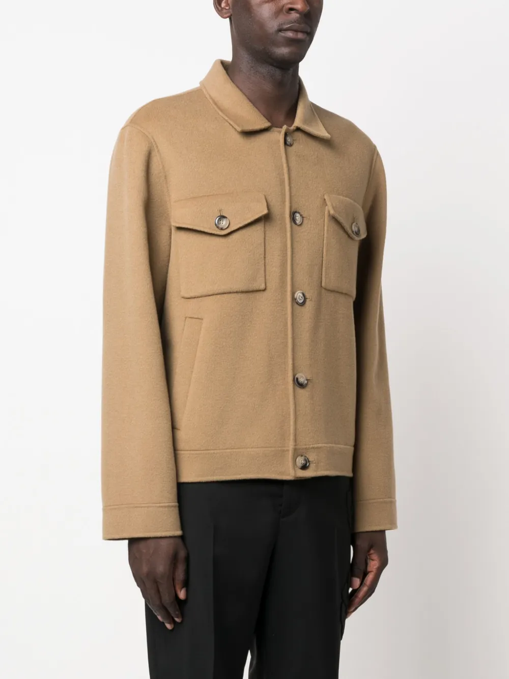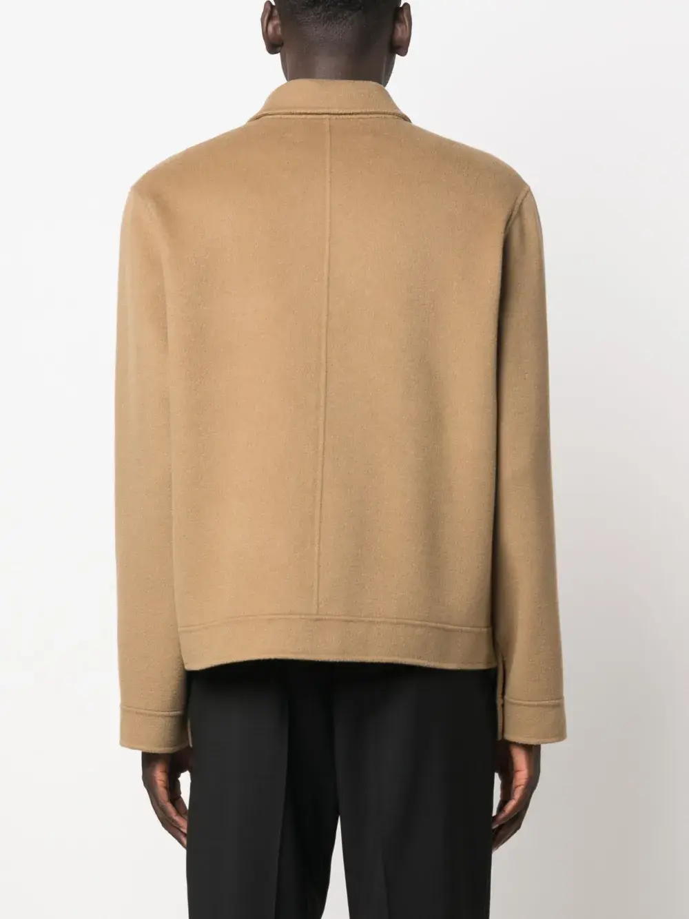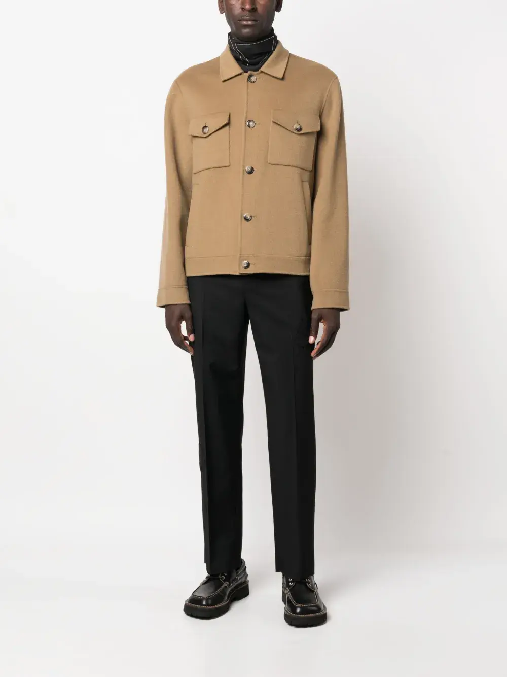 Хаки, смесь шерсти и шелка, косой воротник, застежка на пуговицах спереди, длинные рукава, два передних кармана с клапанами, два кармана по бокам и прямой подол. Узнать больше о том, какие товары получают отметку «Ответственный выбор», можно из материала «Как мы оцениваем экологичность и этичность».