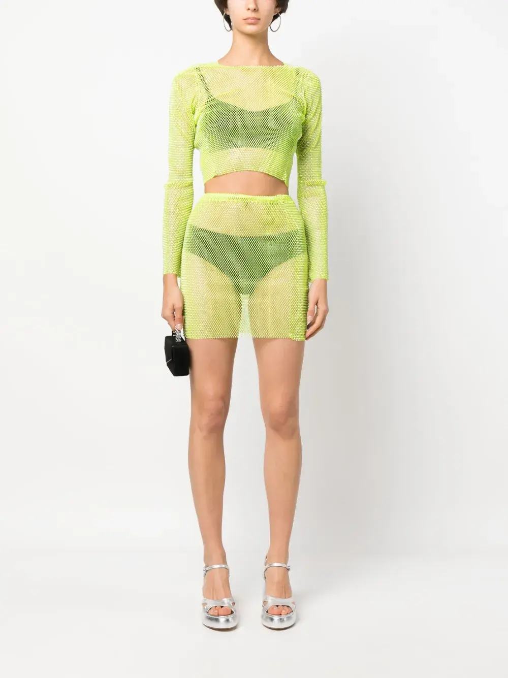 Неоново-зеленый, украшения из горного хрусталя, прозрачный материал, сетка, эластичный пояс, длина до бедер и необработанный подол.