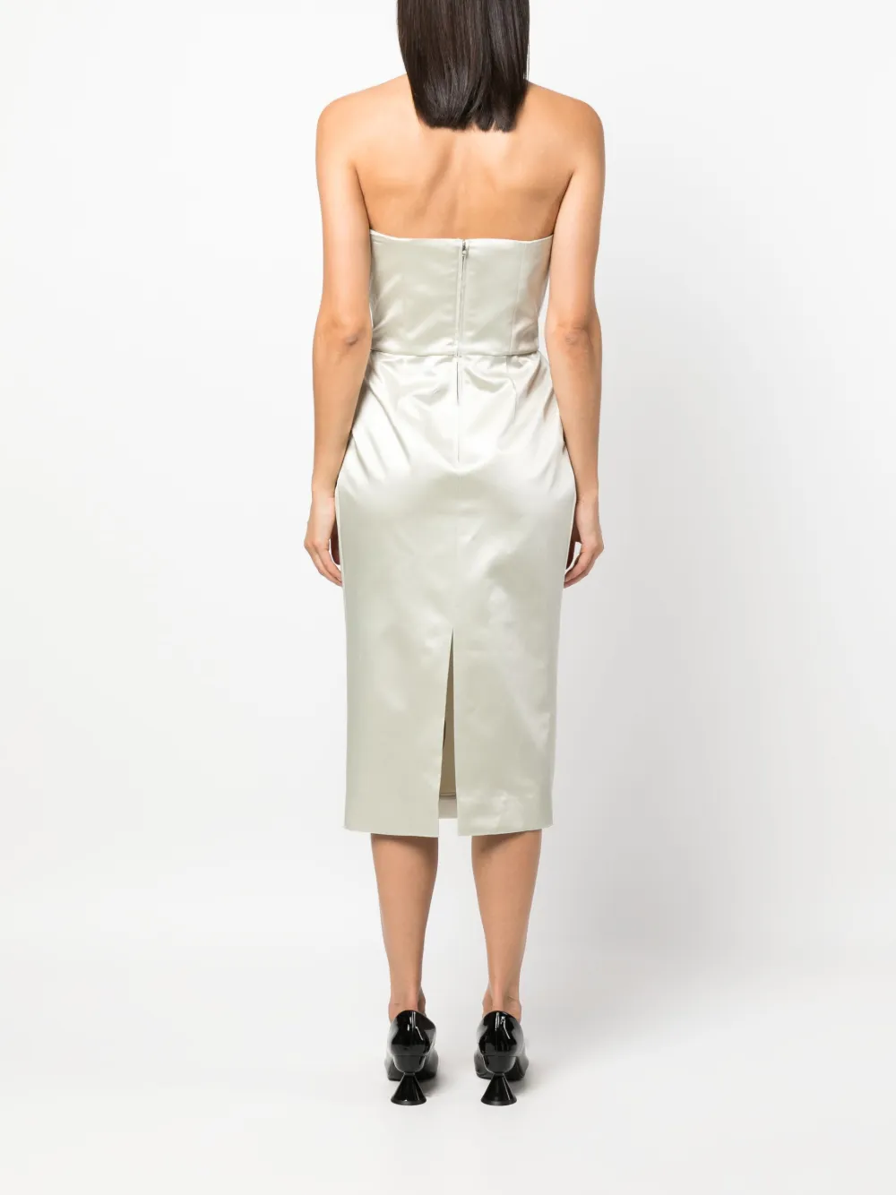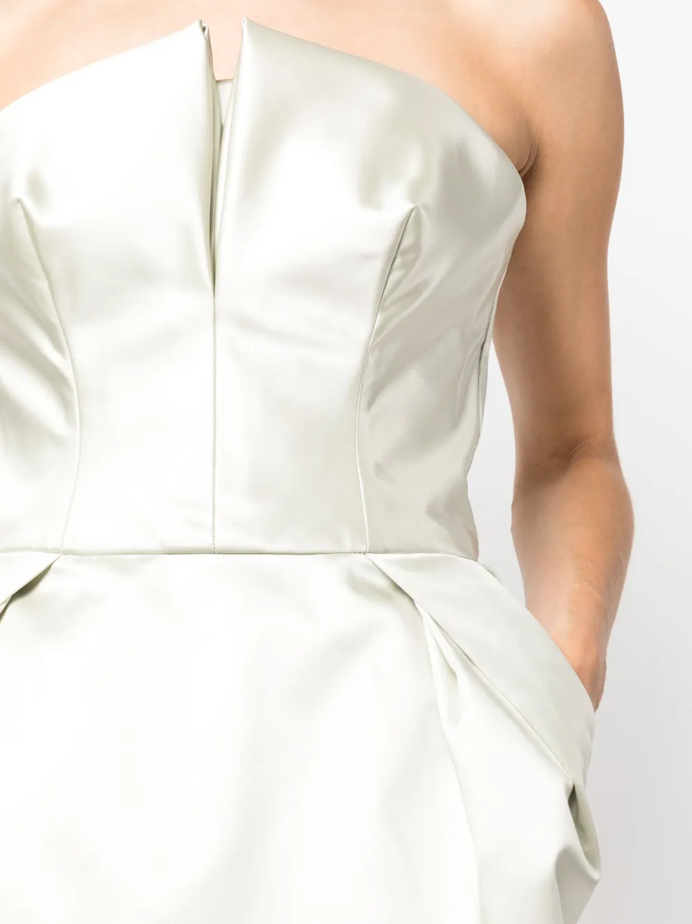 Светло-оливковый, шелк, сатиновая фактура, квадратный вырез, без бретелей, без рукавов, дизайн со сборками и длина до середины икры.