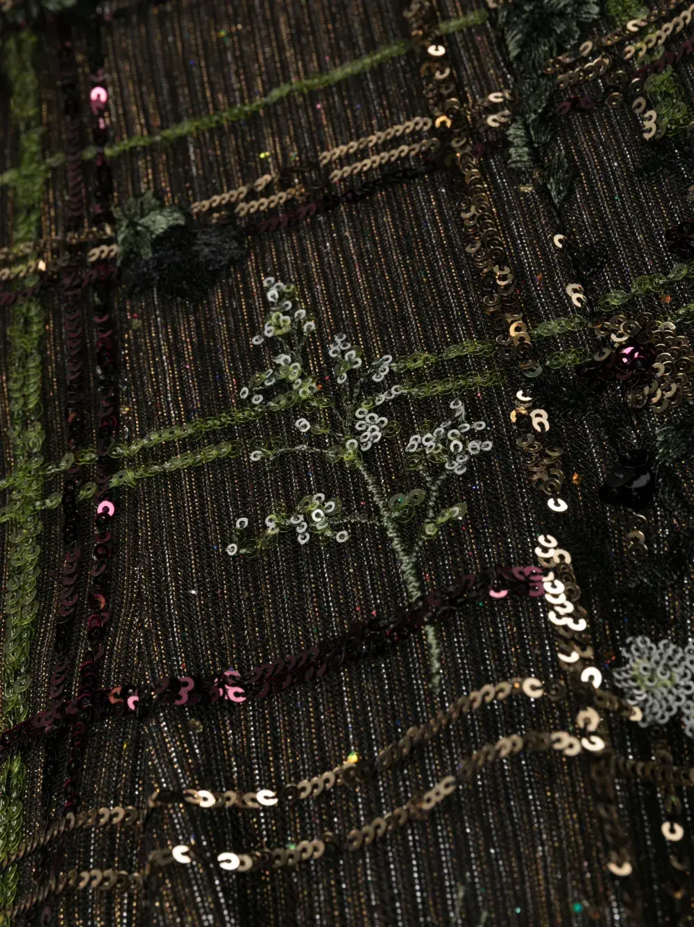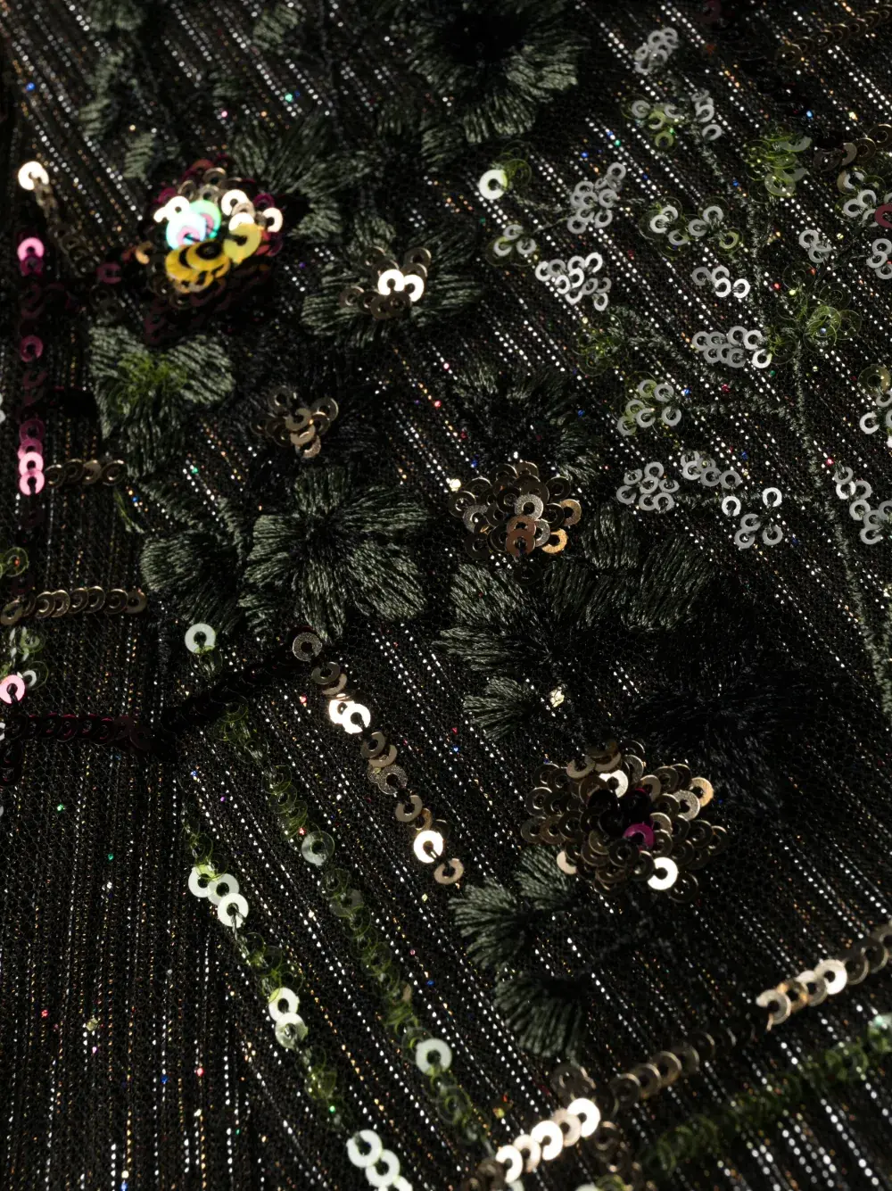 Темно-зеленый, расклешенный крой, покрытие с эффектом металлик, украшение из пайеток, вырез-лодочка, потайная застежка на молнии сзади, короткие рукава и длина миди.