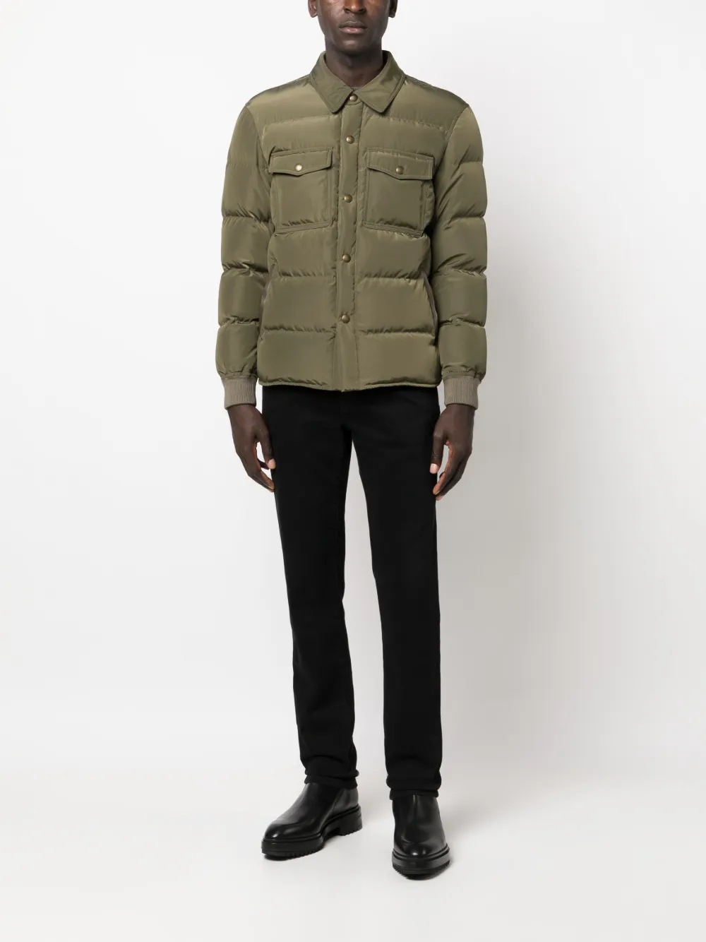 Хаки, телячья кожа, хлопок, дутый материал, наполнитель из смеси пуха и пера, манжеты в рубчик, классический воротник, длинные рукава, манжеты в рубчик, два накладных кармана на груди и прямой подол.