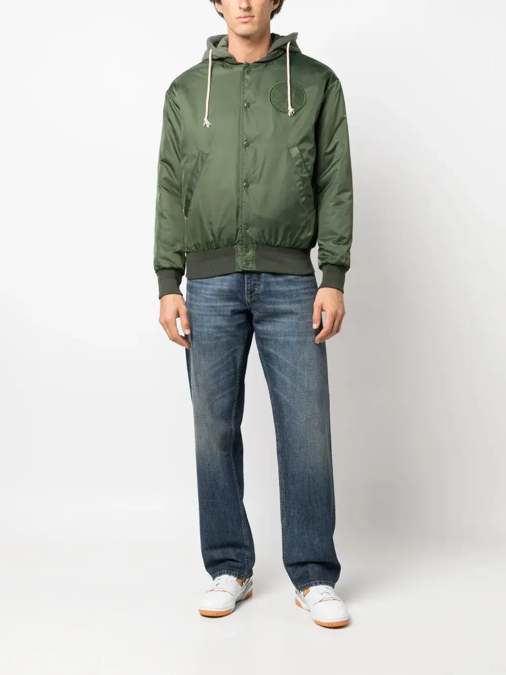 Оливково-зеленый, нашивка с логотипом на груди, вышитый логотип сзади, затягивающийся на шнурок капюшон, воротник-стойка в рубчик, застежка на кнопках спереди, длинные рукава, два прорезных кармана сбоку и прямой подол.