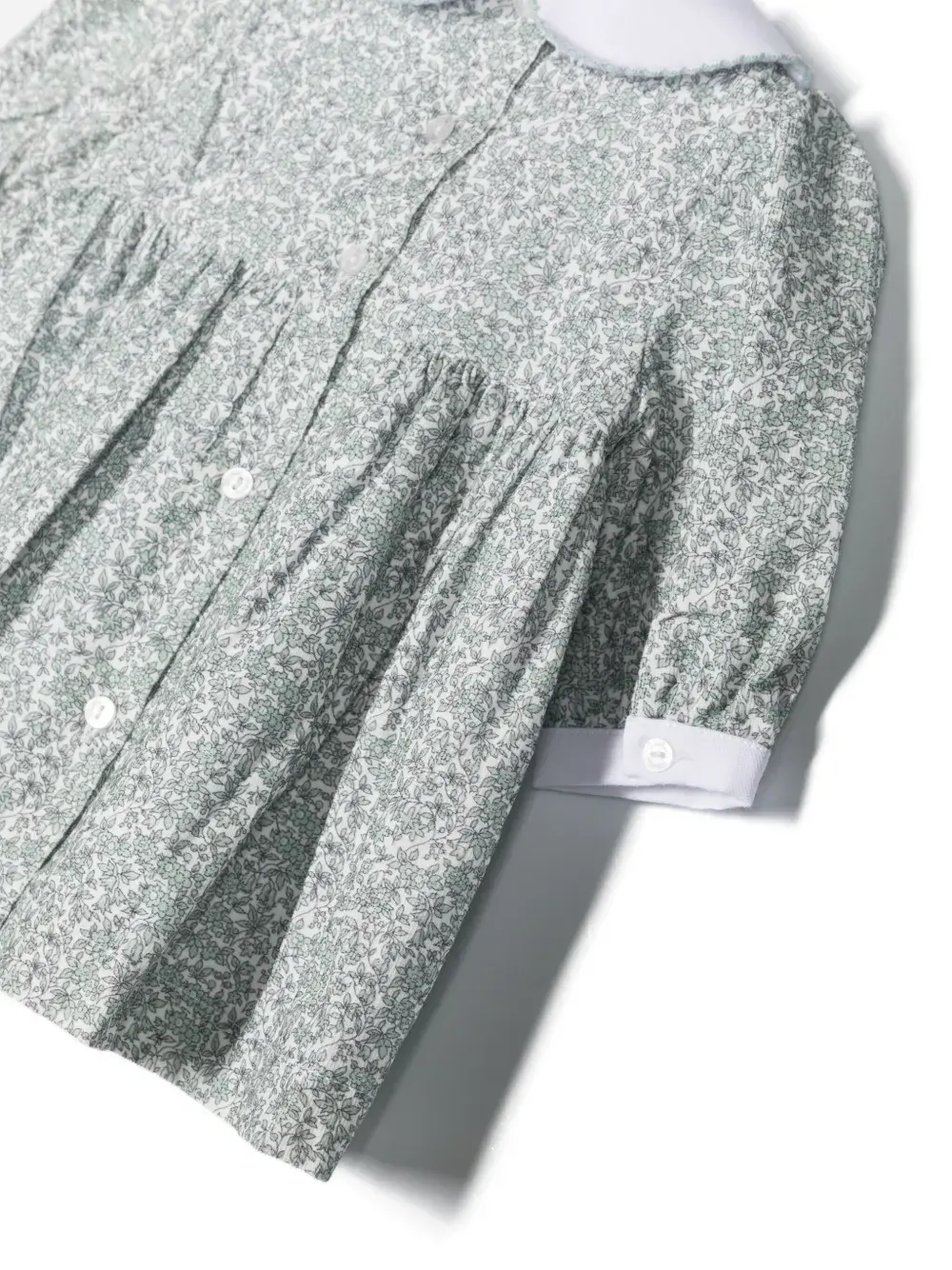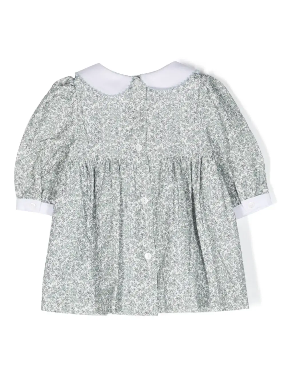 Серо-зеленый, хлопок, поплин, сплошной цветочный принт, воротник Питер Пэн, застежка на пуговицы сзади, длинные рукава, манжеты на пуговицах, складки и прямой подол.