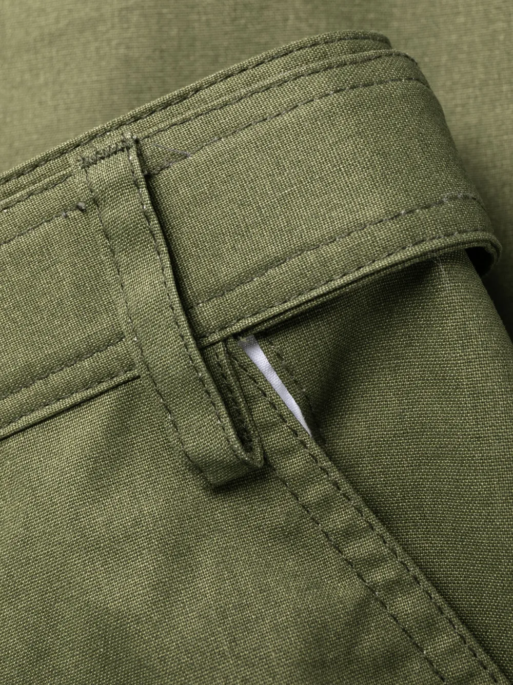 Хаки, хлопок, средняя посадка, петли для ремня, нашивка с логотипом сзади, потайная застежка на молнии и пуговицах, прорезной карман спереди, два вшитых кармана по бокам, два кармана с листочкой сзади и широкий крой.