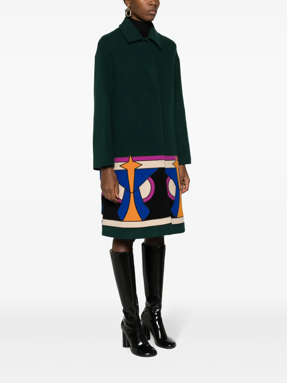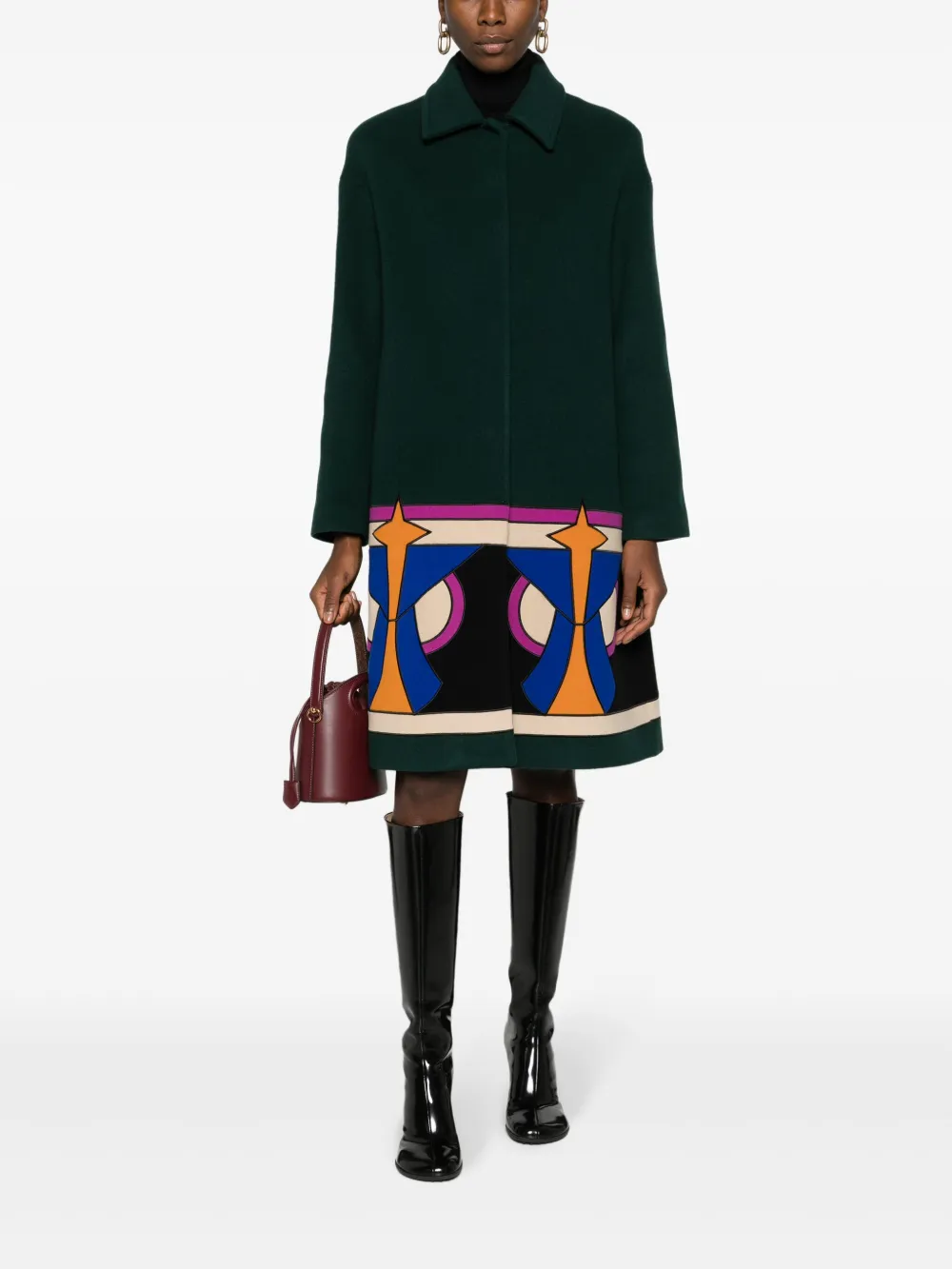Темно-зеленый, разноцветный, смесовая необработанная шерсть, классический воротник, приспущенные плечи, потайная пуговичная застежка спереди, длинные рукава, вязка в технике интарсия, длина выше колена и прямой подол.