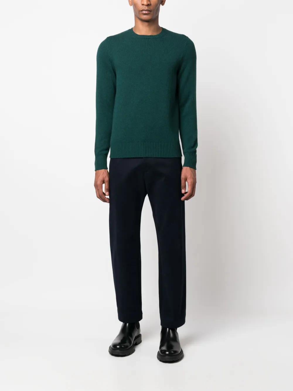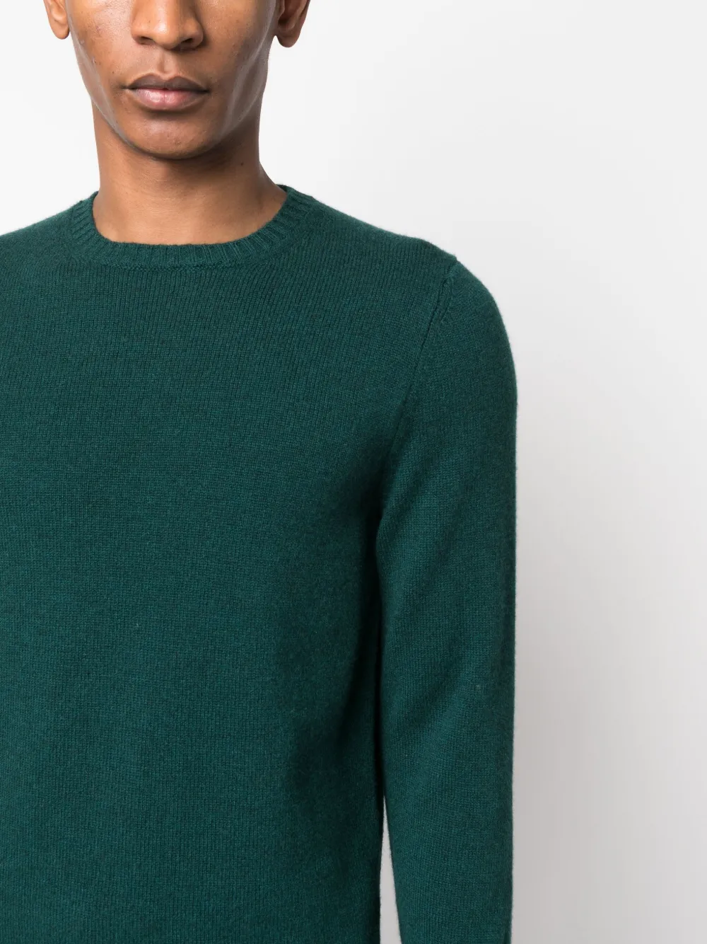 Темно-зеленый, кашемир, трикотажный материал, тонкая вязка, круглый вырез, длинные рукава и прямой подол.