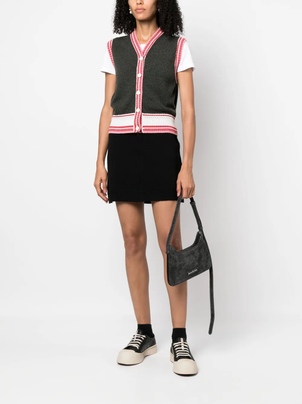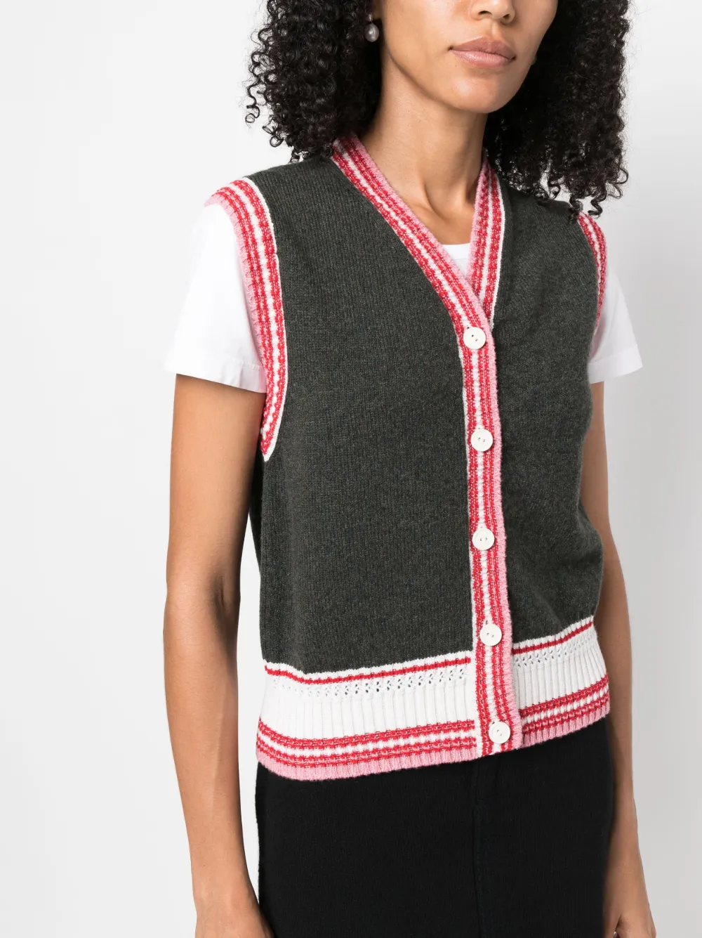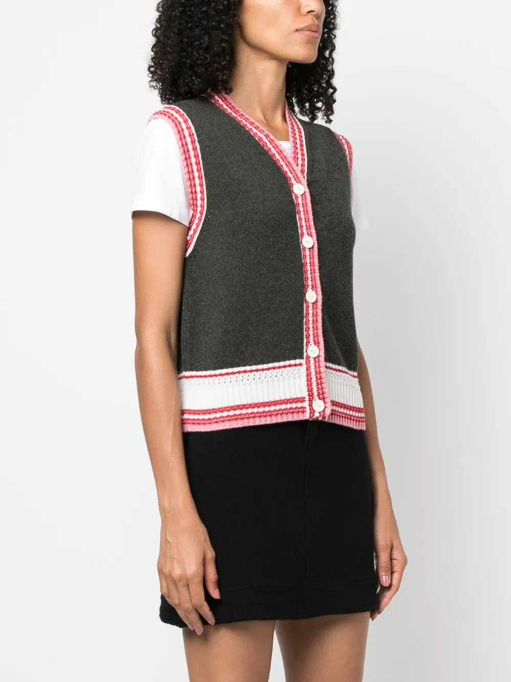 Темно-зеленый, молочно-белый, розовый, кашемир, трикотажный материал, вязаные края в рубчик, полоски, без рукавов, застежка на пуговицах спереди и прямой подол.