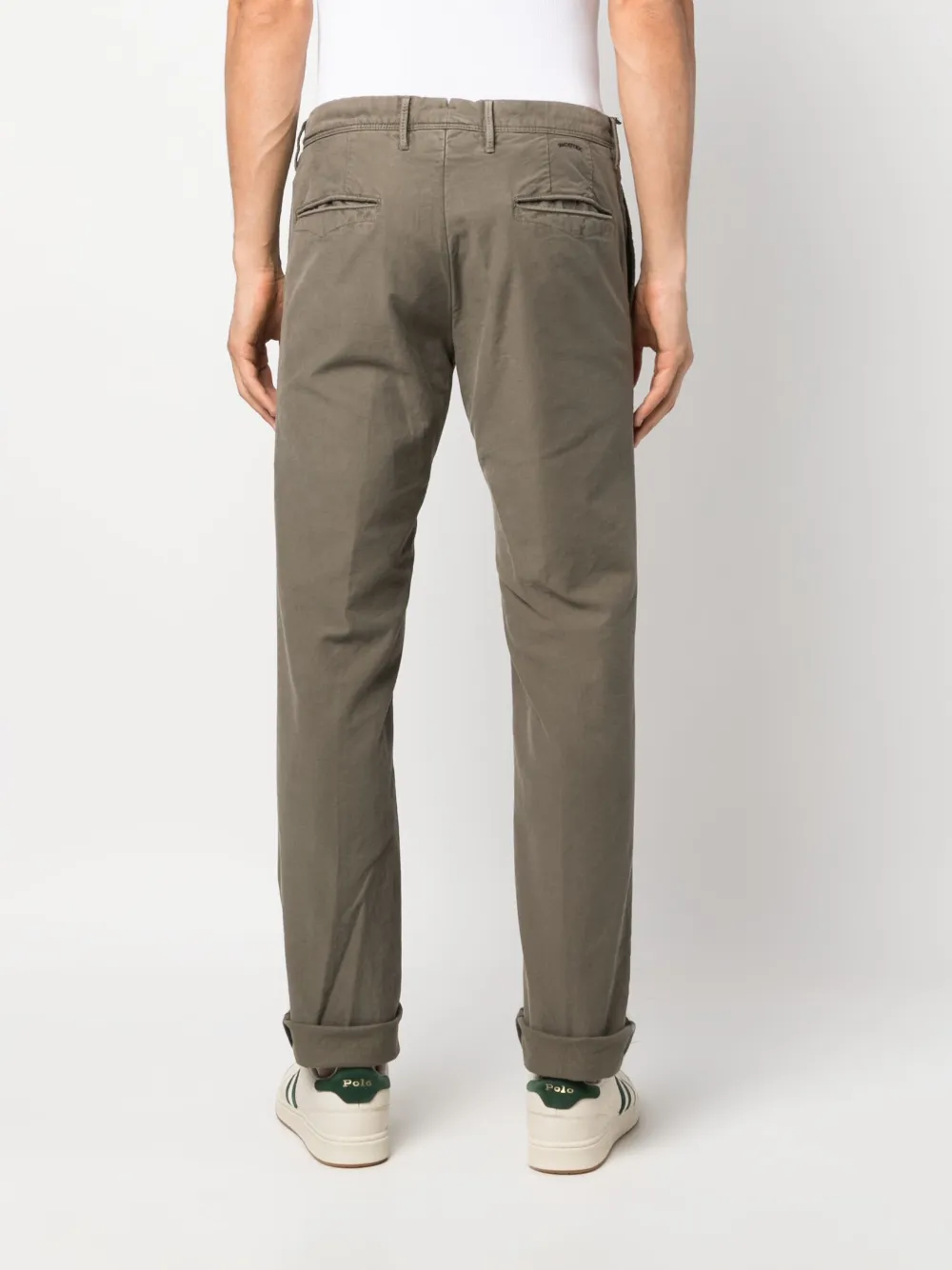 Хаки, эластичный хлопок, петли для ремня, потайная застежка на молнии и пуговицах, два кармана с листочкой сзади и узкий крой.