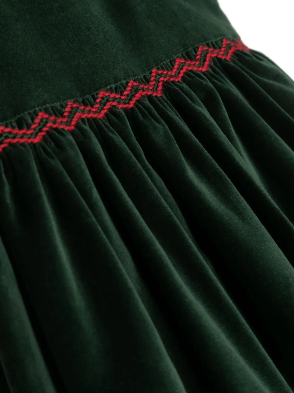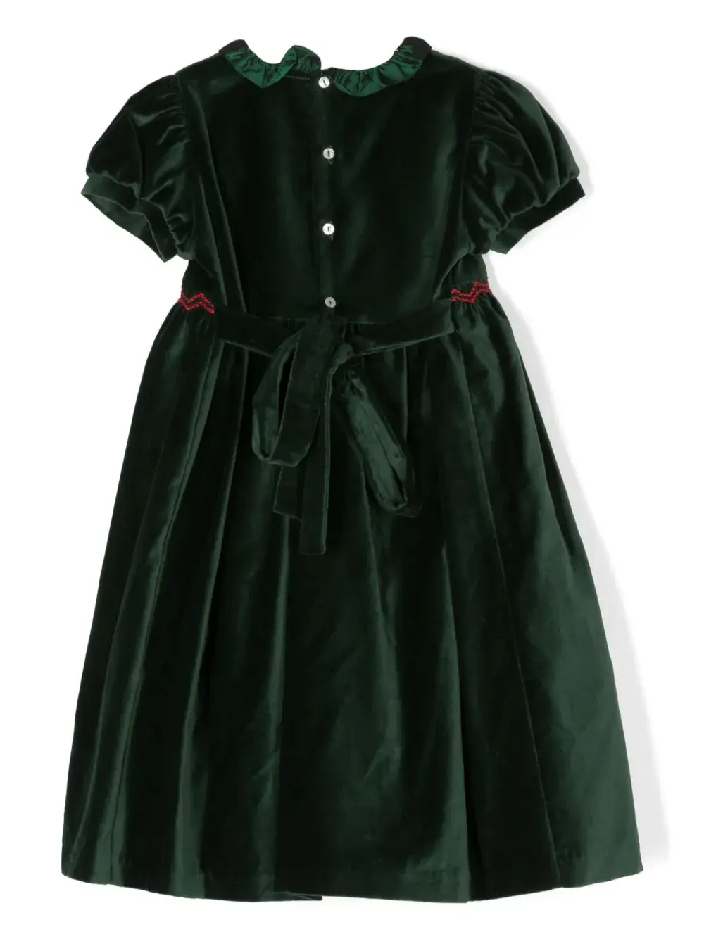 Темно-зеленый, хлопок, бархатный эффект, вышивка в горизонтальную полоску, воротник Питер Пэн, короткие рукава, эластичные манжеты, застежка на пуговицы сзади, завязка на бант сзади, юбка А-образного силуэта и прямой подол.