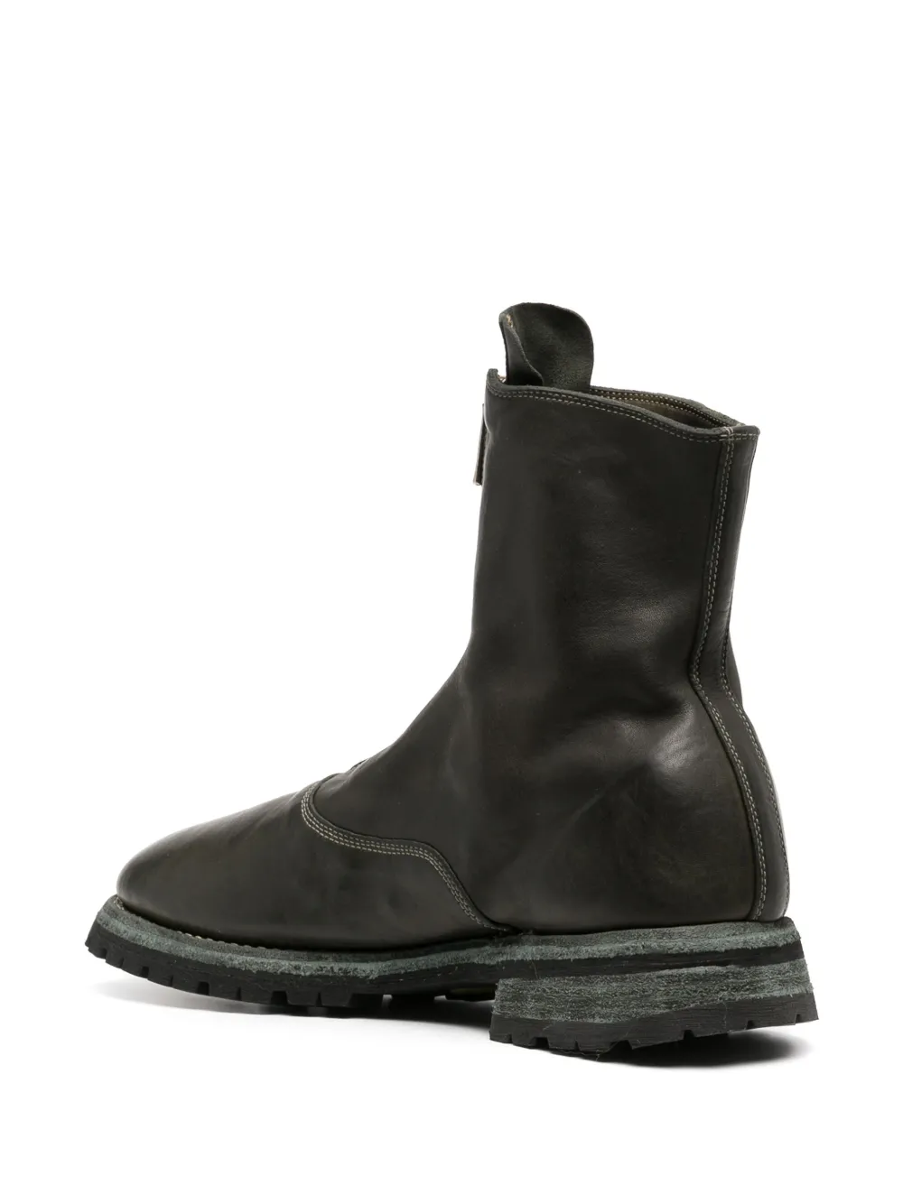 Темно-зеленый, телячья кожа, декоративная строчка, высота по щиколотку, петля для подтягивания на язычке, застежка на молнии спереди, закругленный носок, резиновая подошва и низкий блочный каблук. Это унисекс-модель. Обратите внимание, что для нее используется мужская размерная сетка.