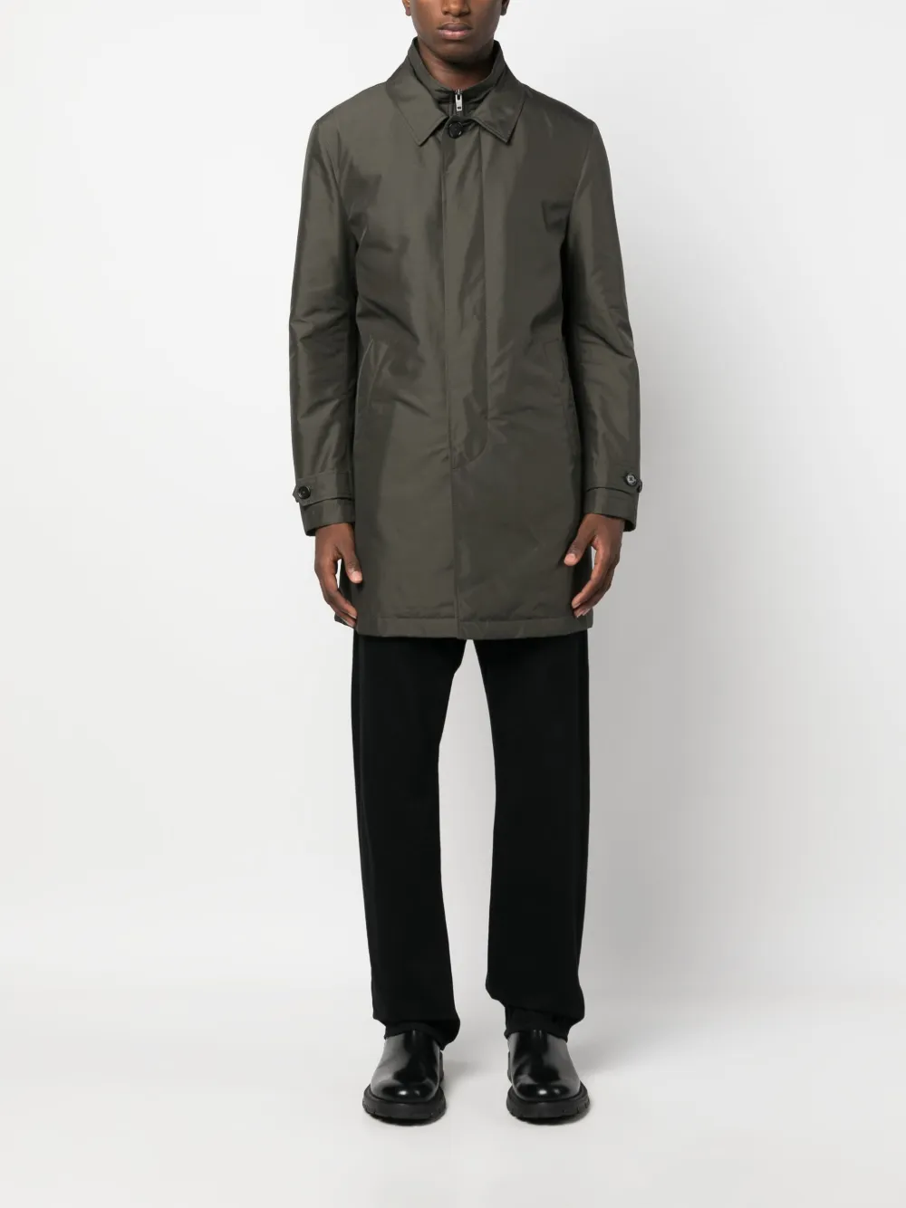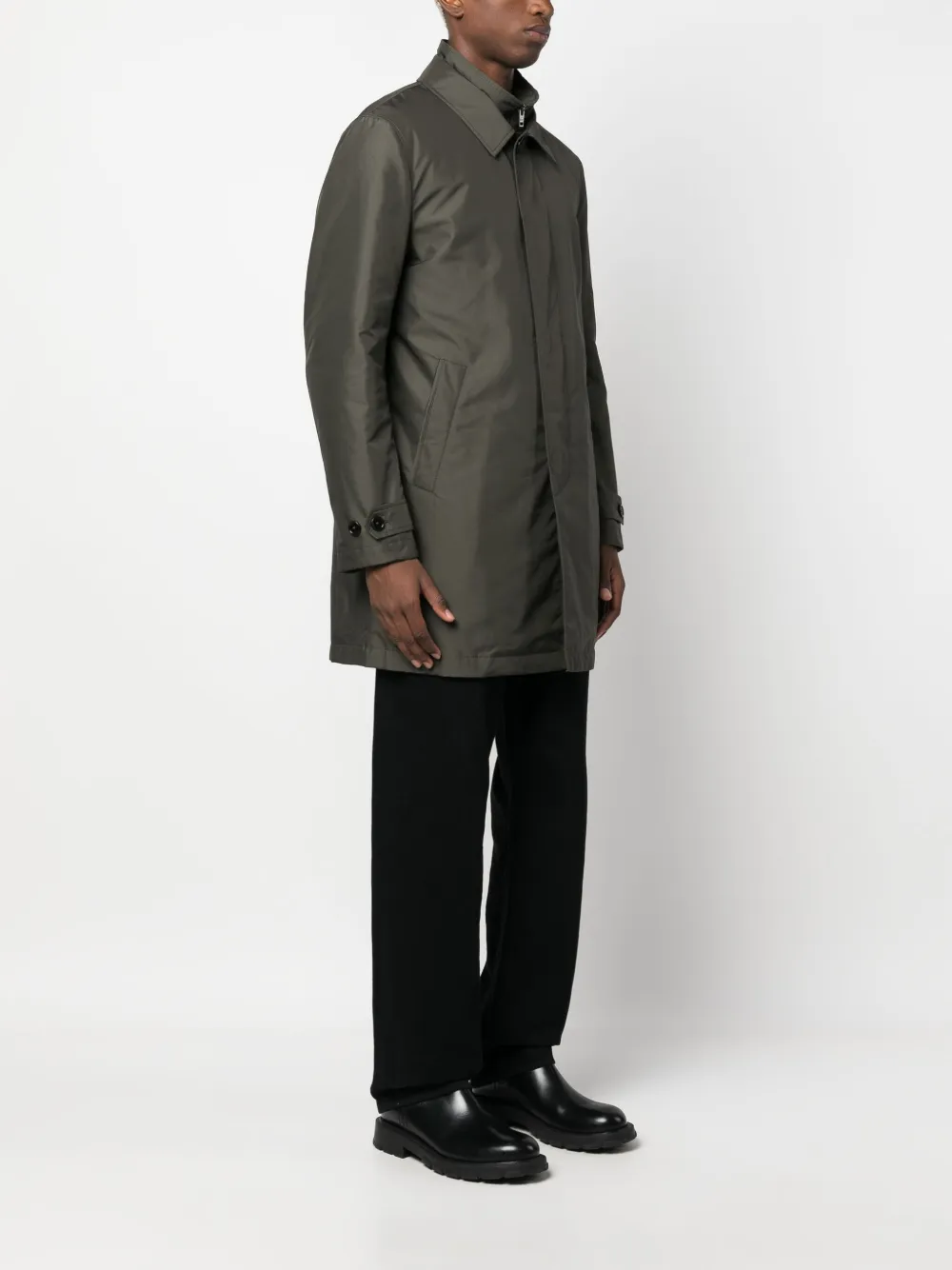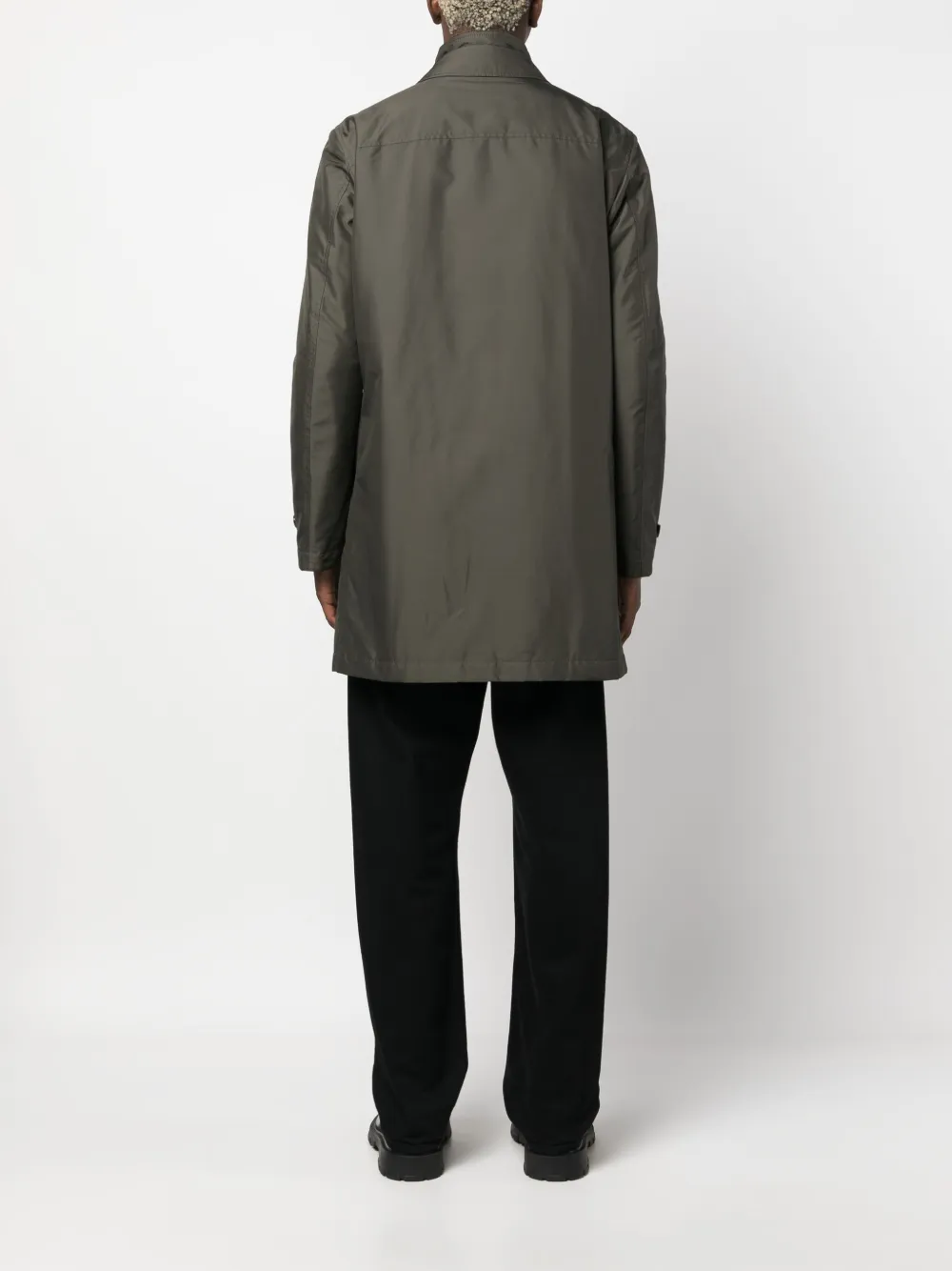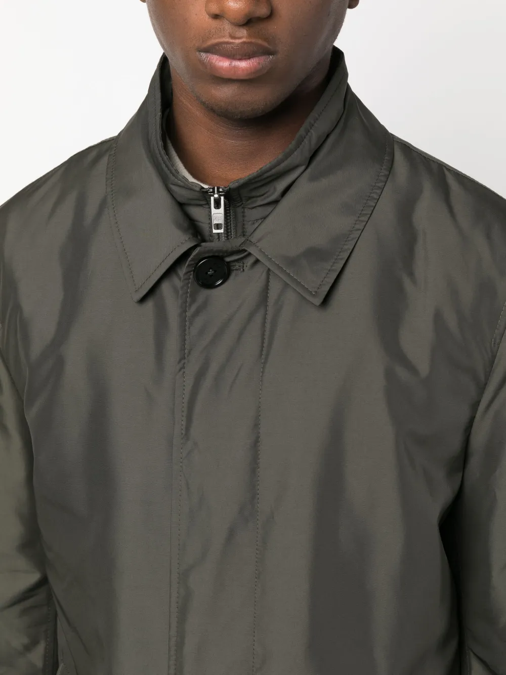 Оливково-зеленый, водонепроницаемый, манжеты на пуговицах, двухслойный материал, плоский заостренный воротник, высокий воротник, длинные рукава, застежка на молнии и пуговице спереди, два передних кармана с листочкой и прямой подол.