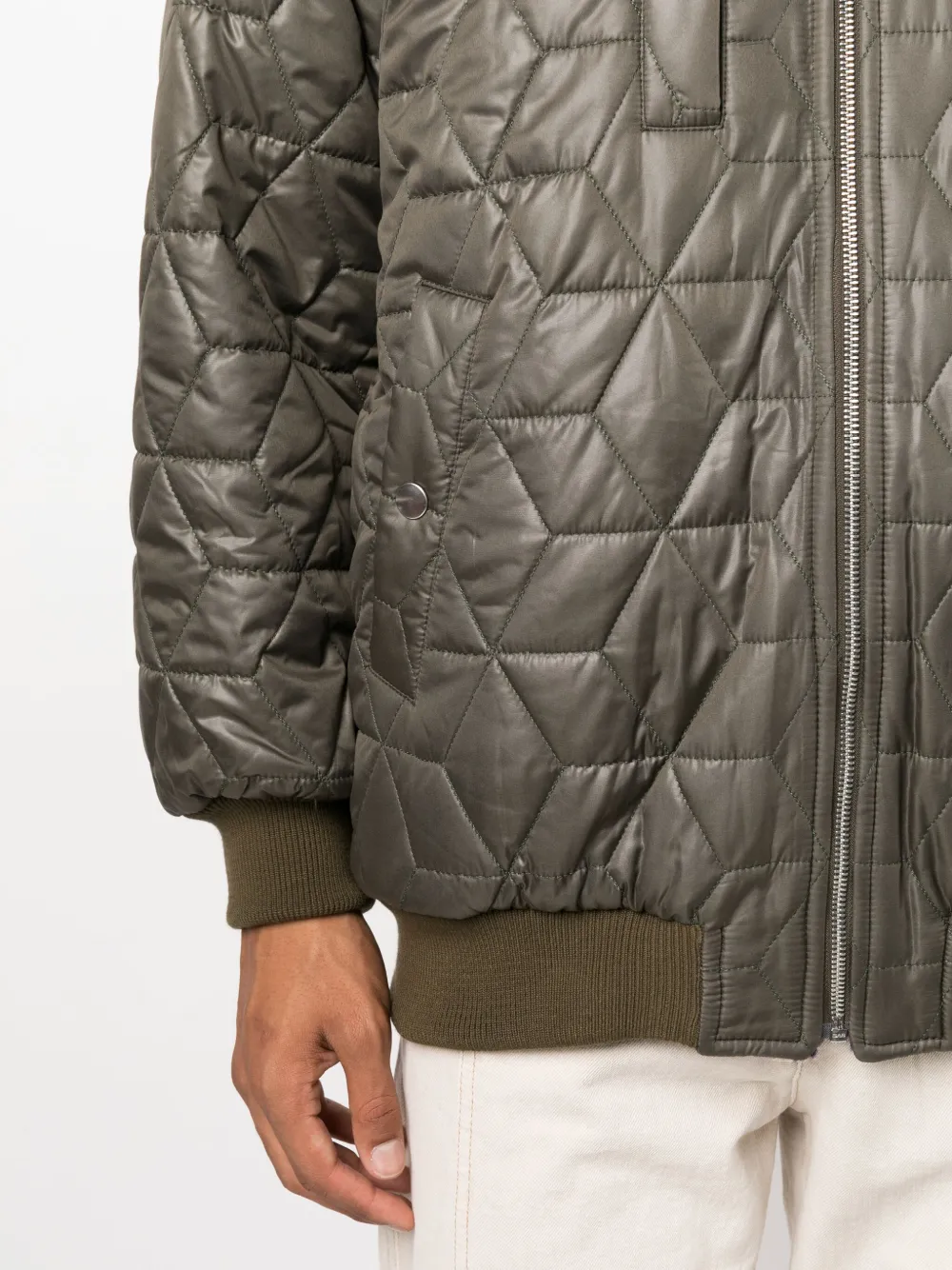 Хаки, смесовая шерсть, стеганая модель, вязка в технике интарсия, двусторонний дизайн, воротник-стойка в рубчик, длинные рукава, нагрудный карман на кнопке и два кармана на кнопке по бокам.