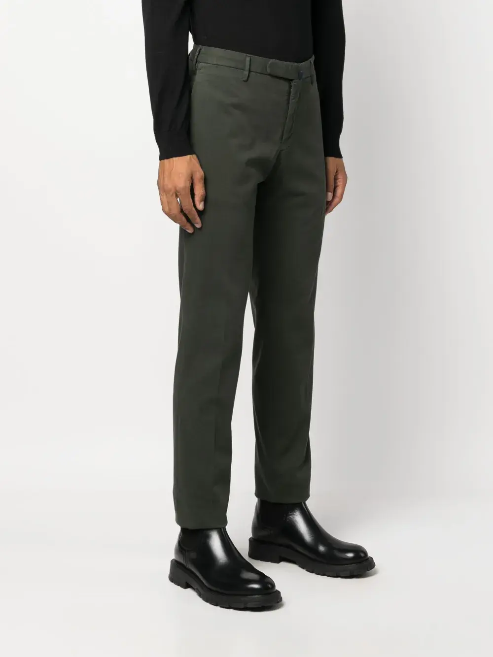 Темно-зеленый, смесовый хлопок, прямой крой, средняя посадка, потайная застежка спереди, петли для ремня, два прорезных кармана по бокам, два кармана с листочкой сзади и стрелки.