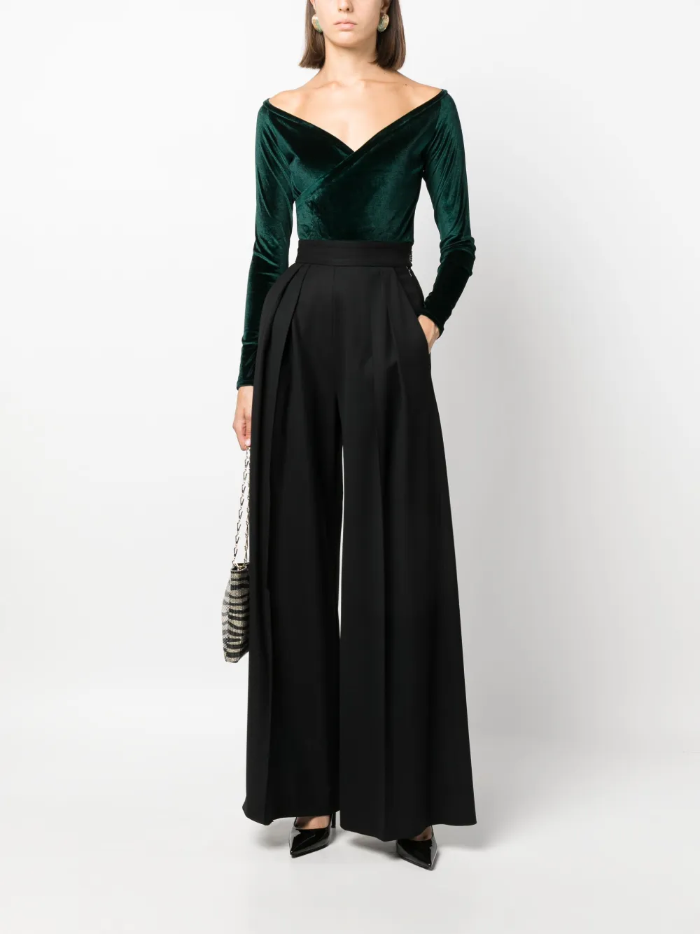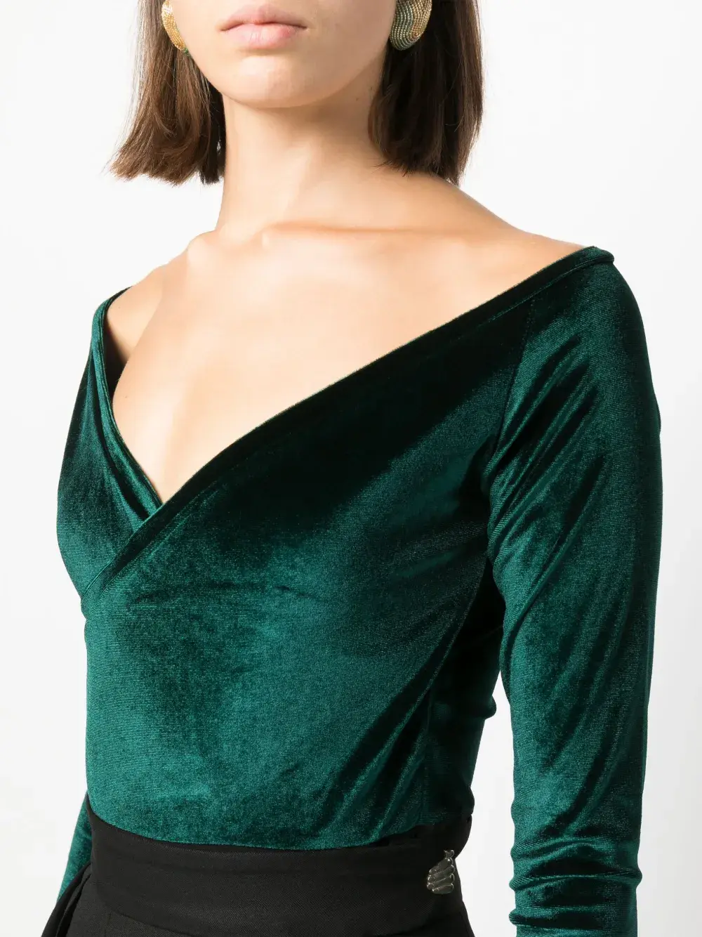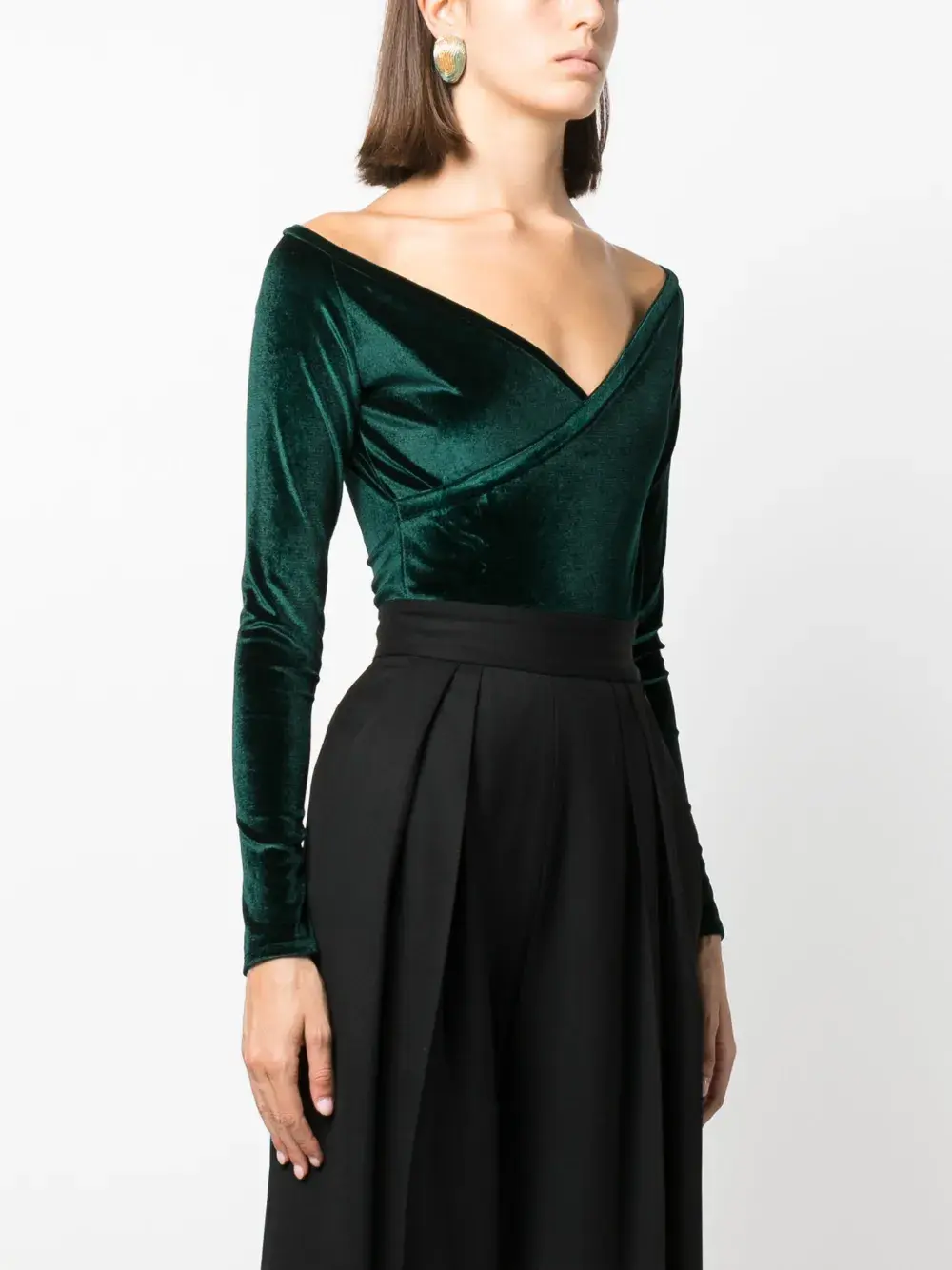 Насыщенный зеленый, бархат, перекрестный вырез, модель планж и длинные рукава.