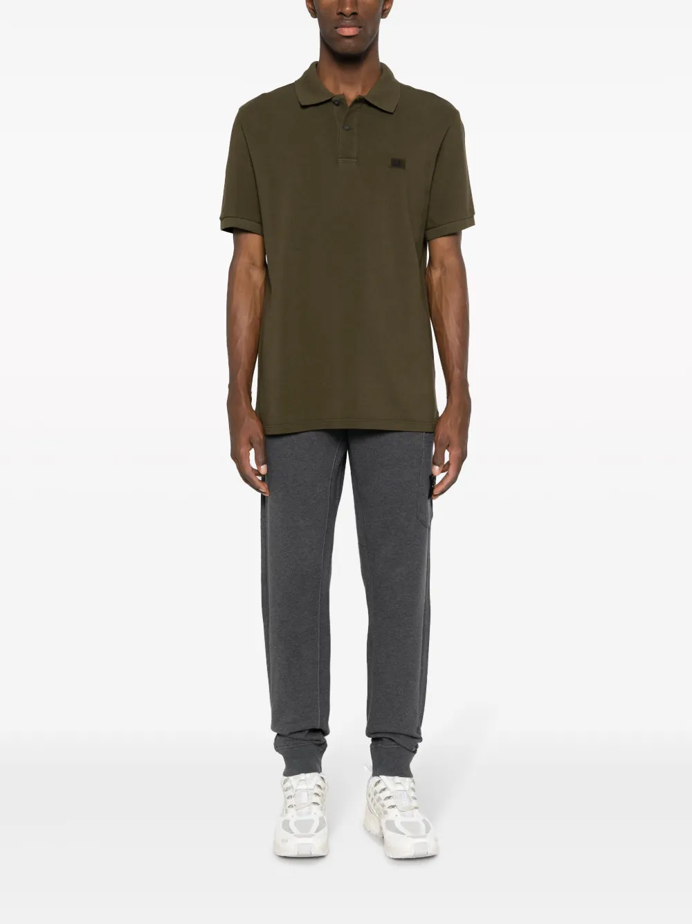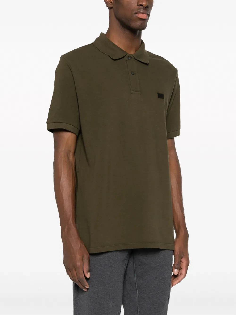 Оливково-зеленый, хлопок, вышитый логотип на груди, воротник поло, планка на пуговицах спереди, короткие рукава и прямой подол.