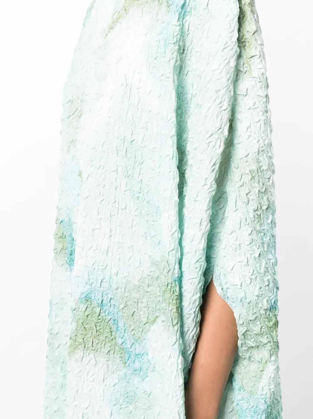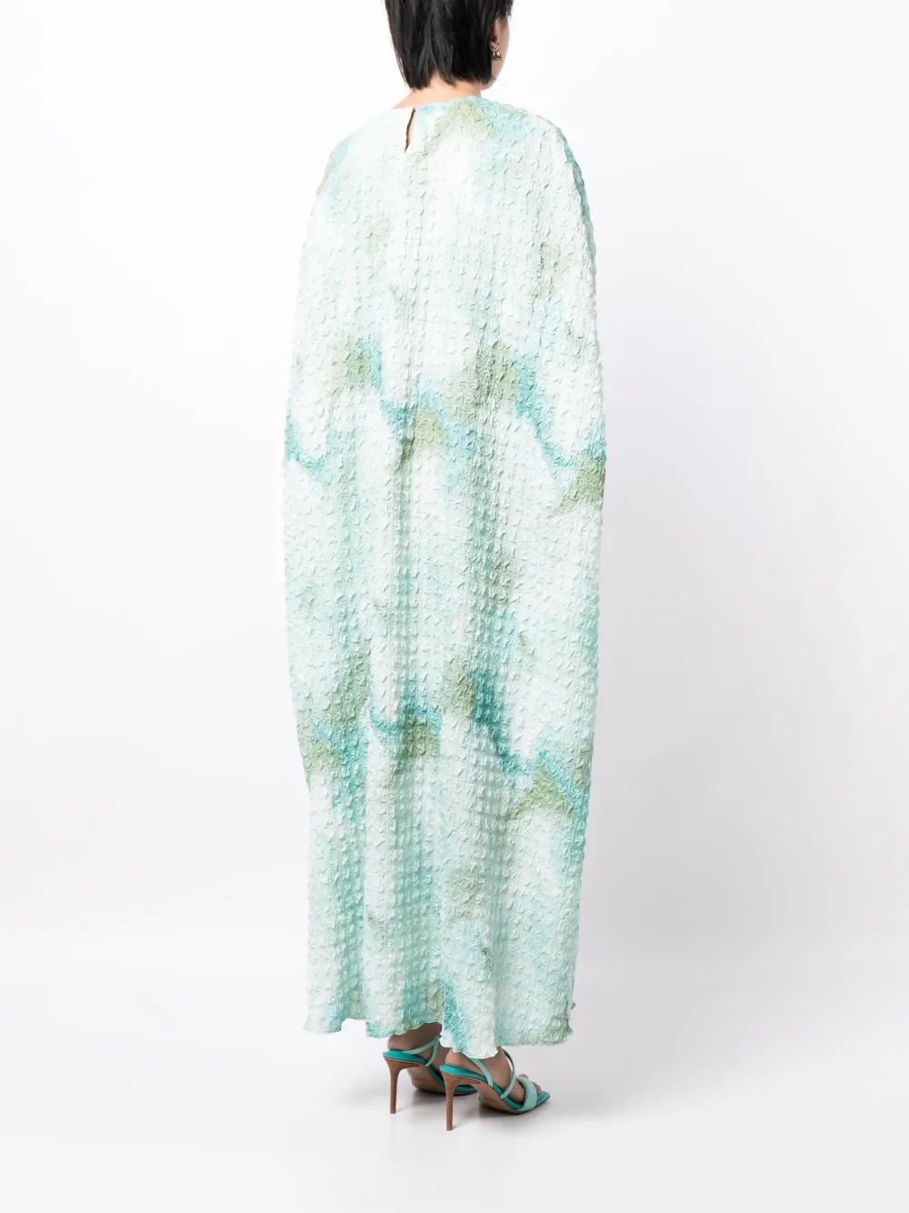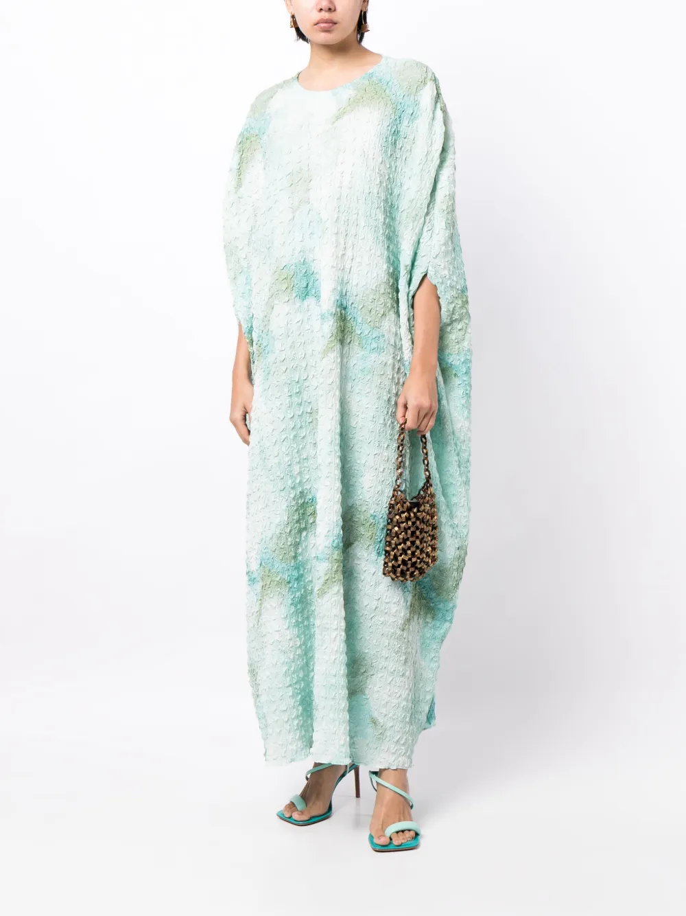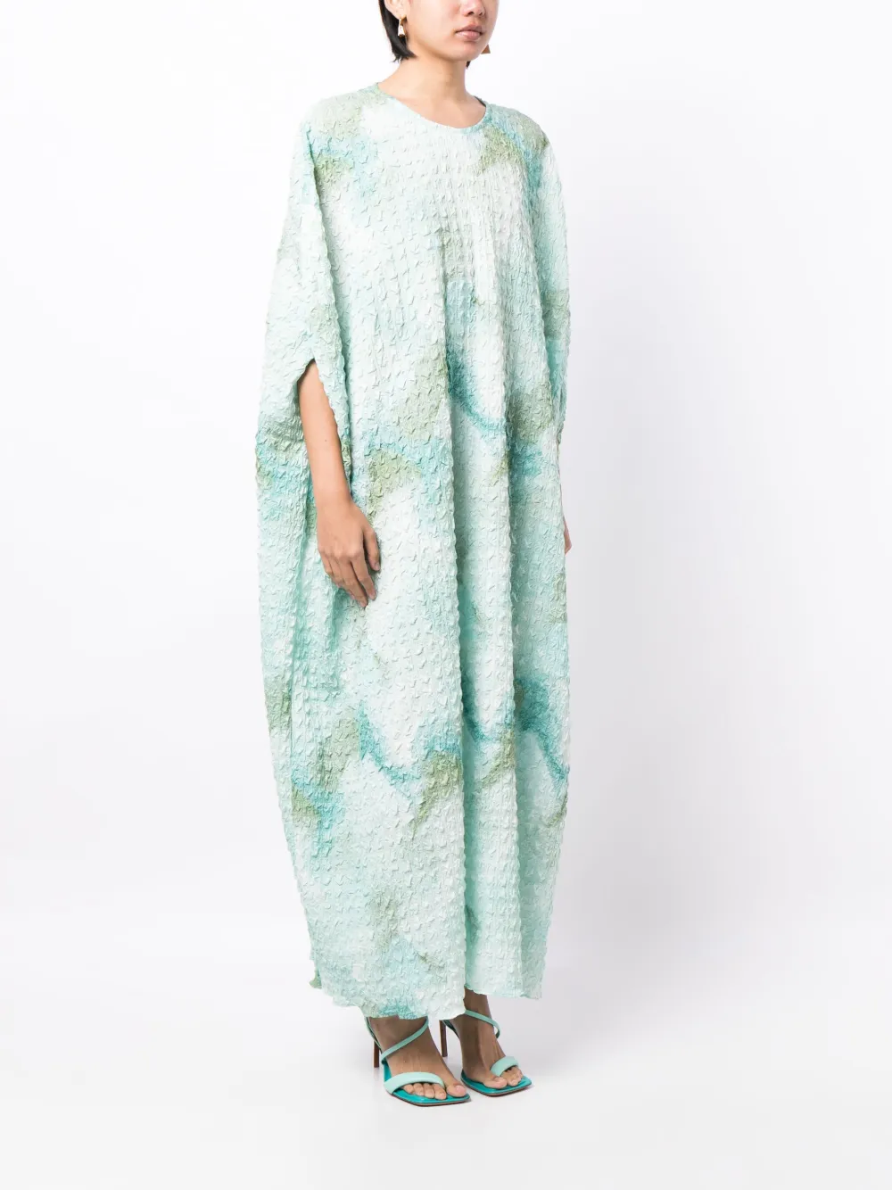 Бирюзовый, жаккард, абстрактный принт, круглый вырез, силуэт «кафтан», рукава три четверти и длинная модель.