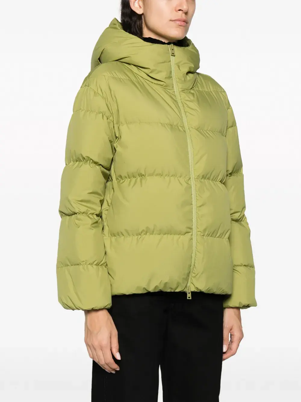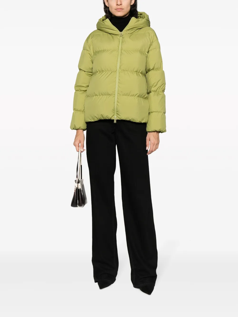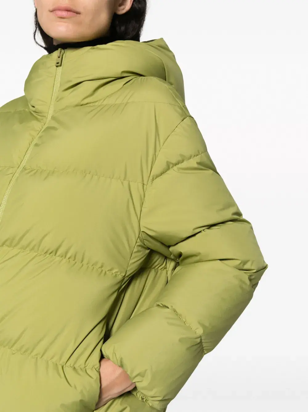 Цвет зеленого яблока, наполнитель из пуха и перьев, дутый материал, классический капюшон, двусторонняя молния спереди, длинные рукава, два вшитых кармана по бокам и прямой подол.