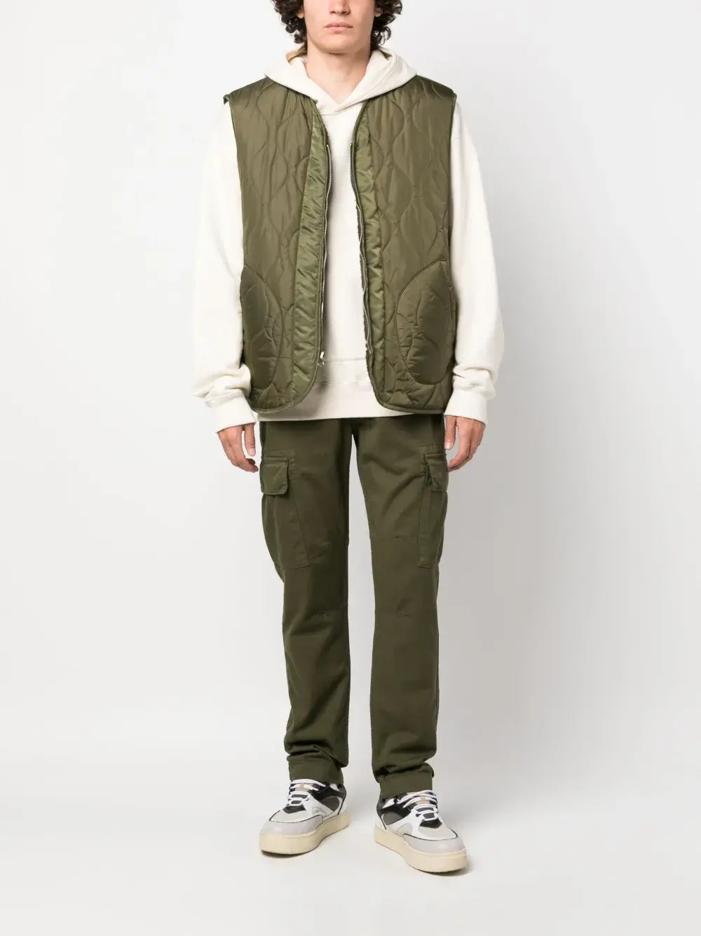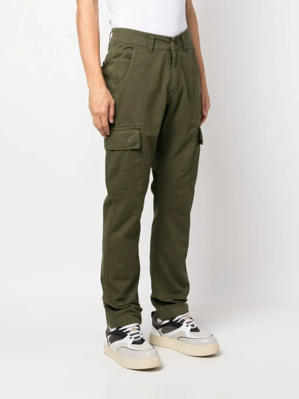 Оливково-зеленый, хлопок, средняя посадка, прямой крой, петли для ремня, застежка на молнии и пуговице спереди, два кармана по бокам и два кармана с клапанами сзади.