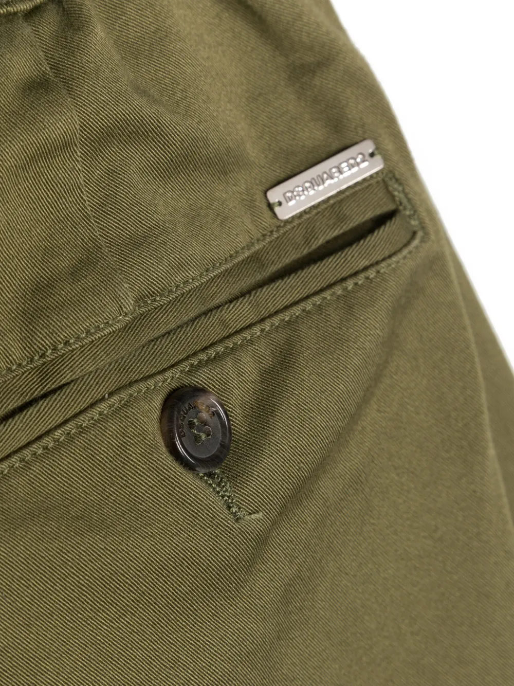 Хаки, эластичный хлопок, серебристый металлический логотип, пуговицы с выгравированным логотипом, эластичный пояс, застежка на молнии и пуговице спереди, петли для ремня, два кармана по бокам, прорезной карман на пуговице сзади, зауженный крой и прямой подол.