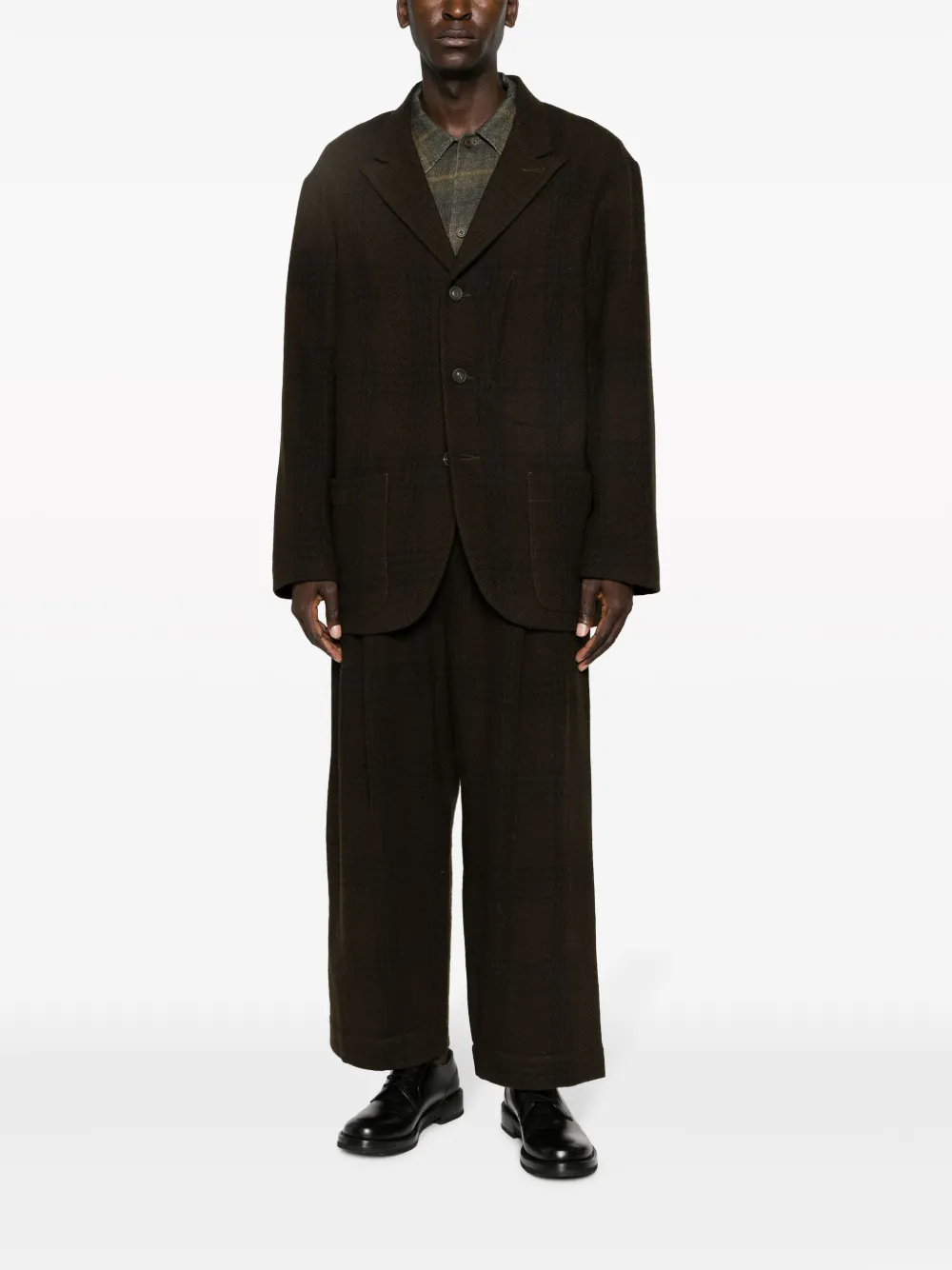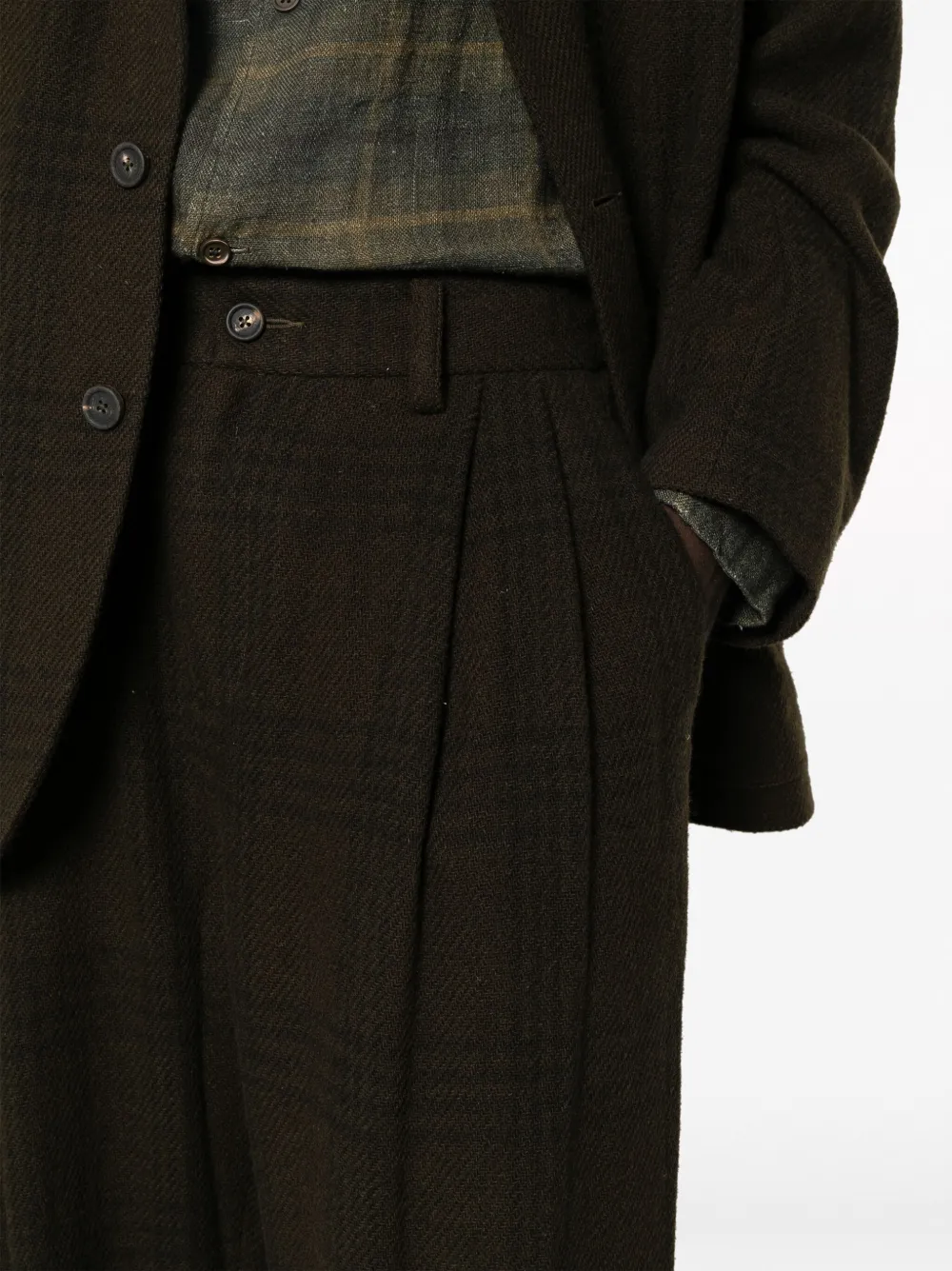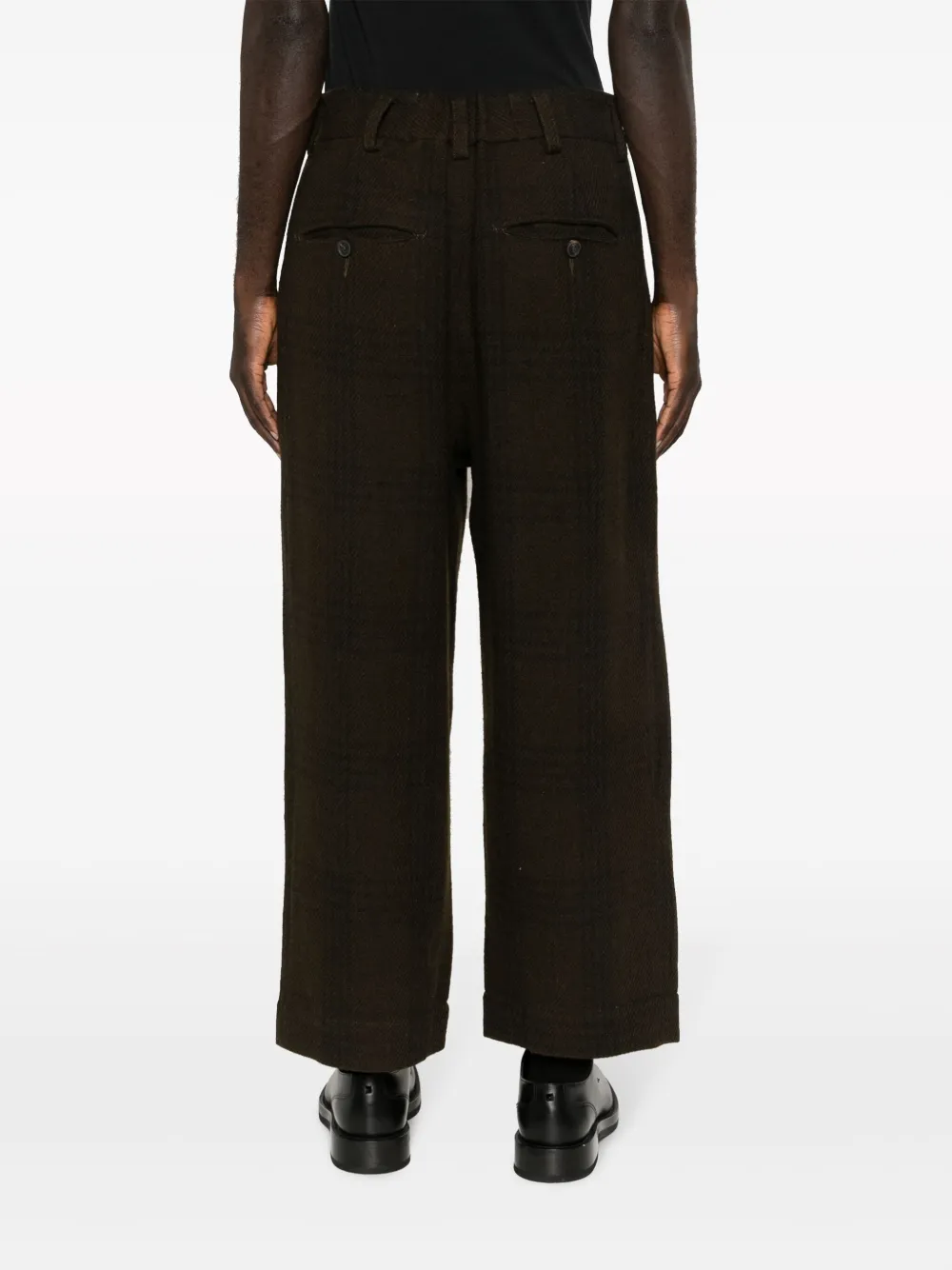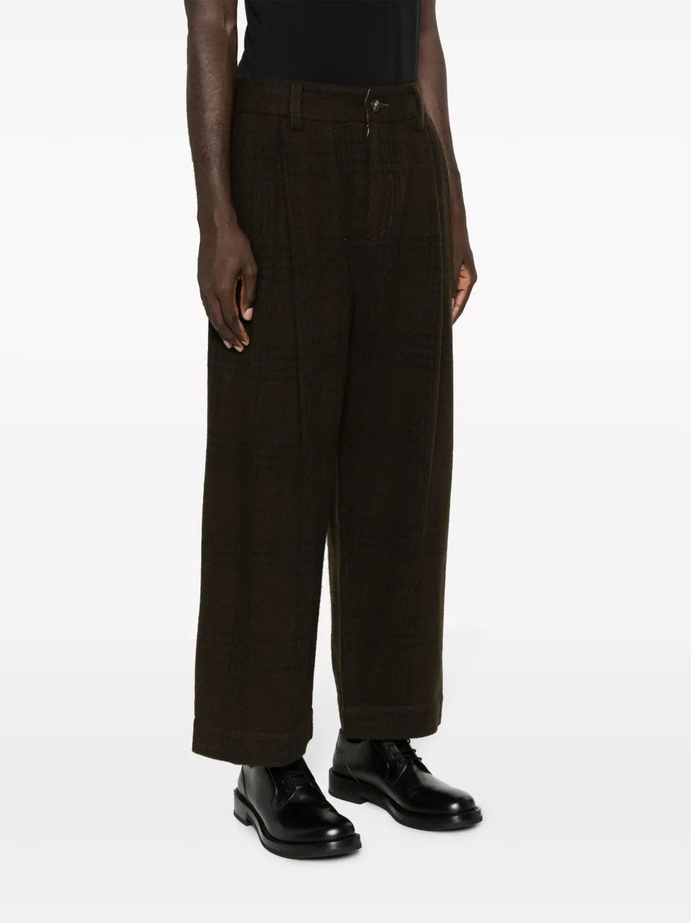 Хаки, шерсть, клетчатый узор, складки, петли для ремня, застежка на молнии и пуговице спереди, широкий крой, два вшитых кармана по бокам, два прорезных кармана на пуговицах сзади, прямой подол и высота по щиколотку.