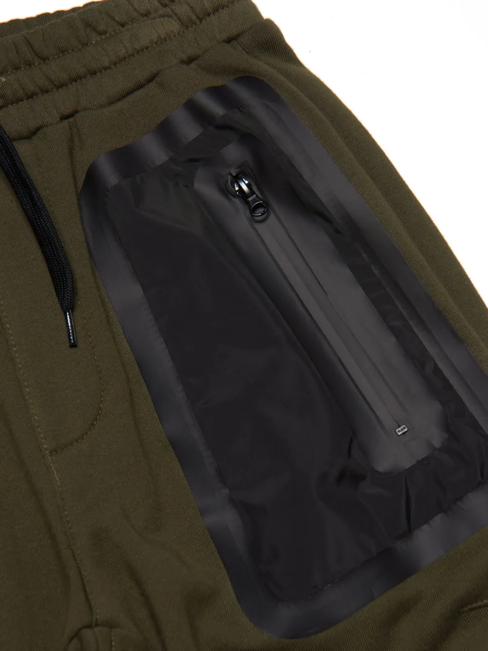 Темно-зеленый, хлопок, вставки, принт с логотипом сзади, кулиска на талии, два кармана на молнии по бокам, накладной карман сзади и эластичные манжеты.