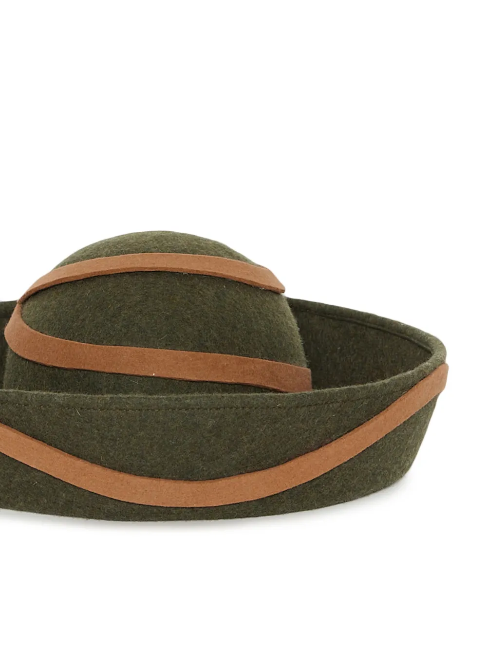 Хаки, шерстяной фетр, ободок с лентой, круглая тулья, подвернутые поля и модель без застежки.