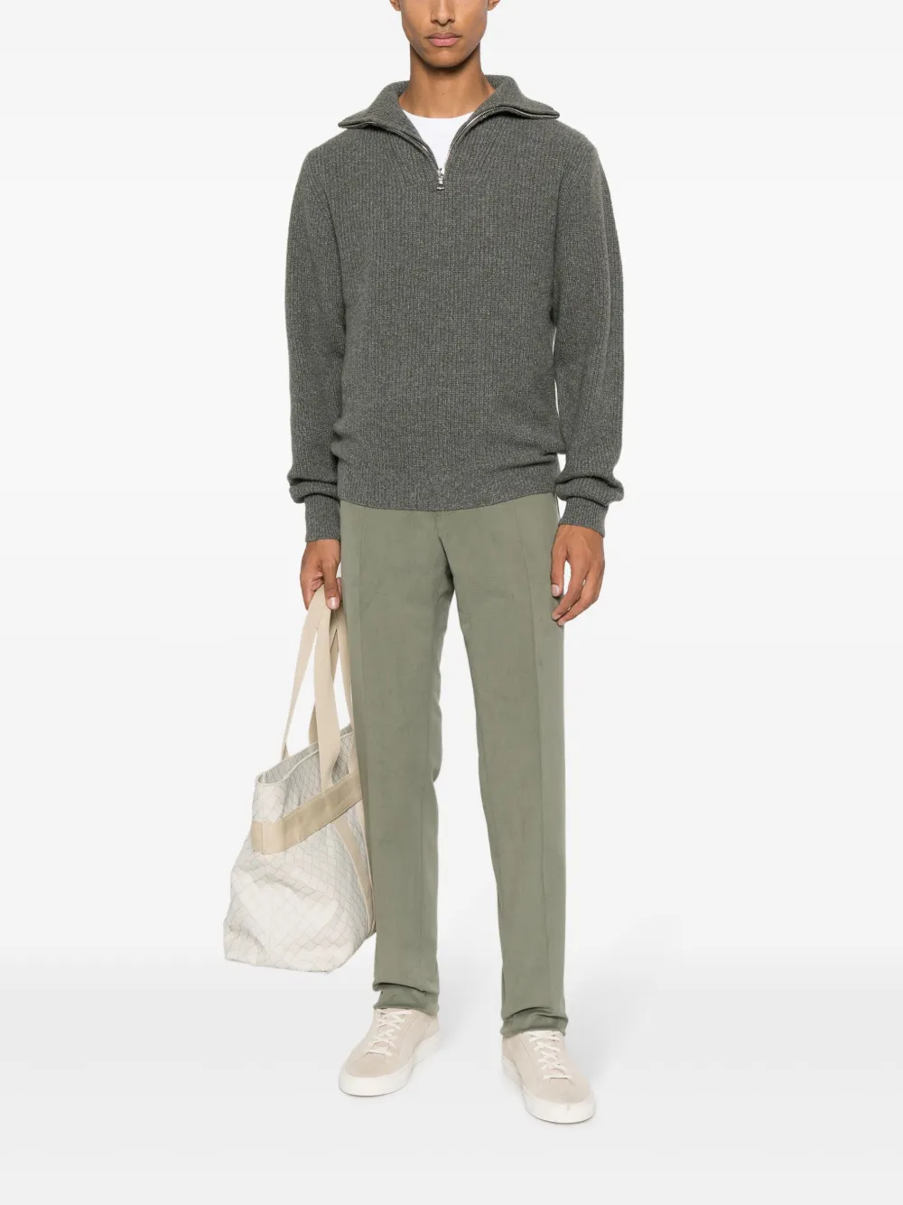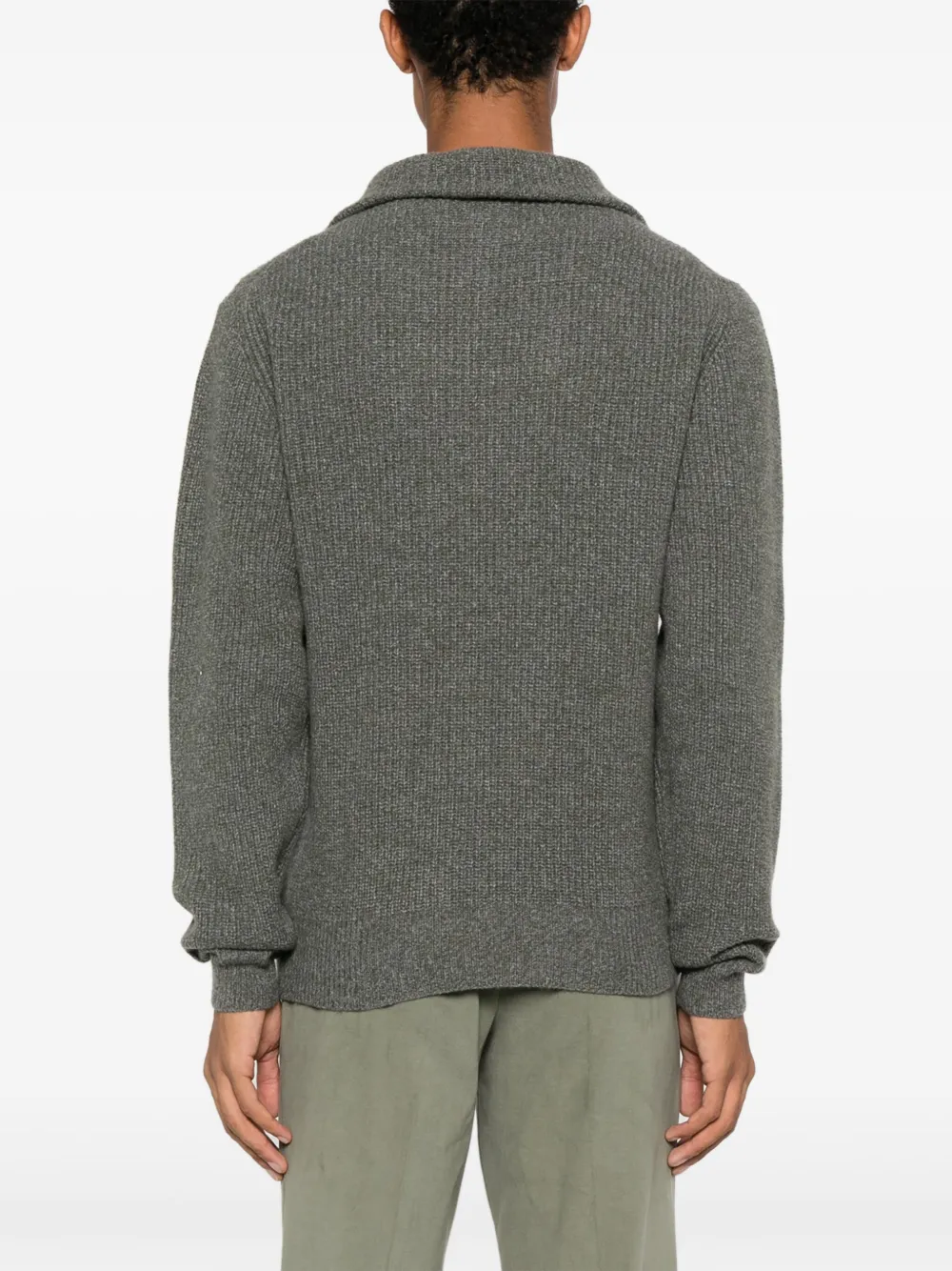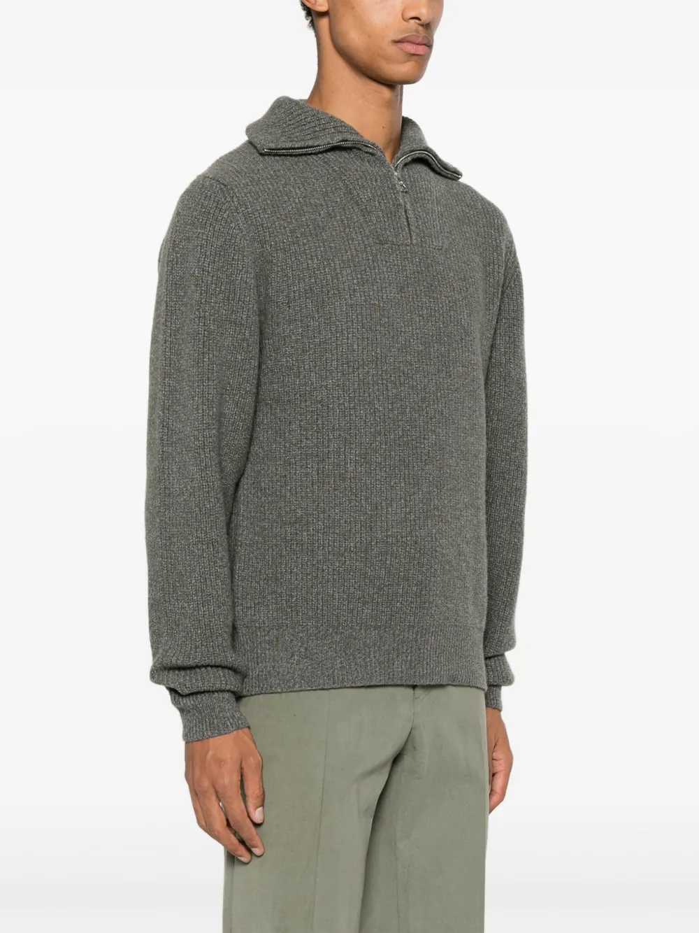 Зеленый, смесь шерсти и кашемира, отделка в рубчик, высокий воротник, короткая застежка на молнии спереди, длинные рукава и прямой подол.