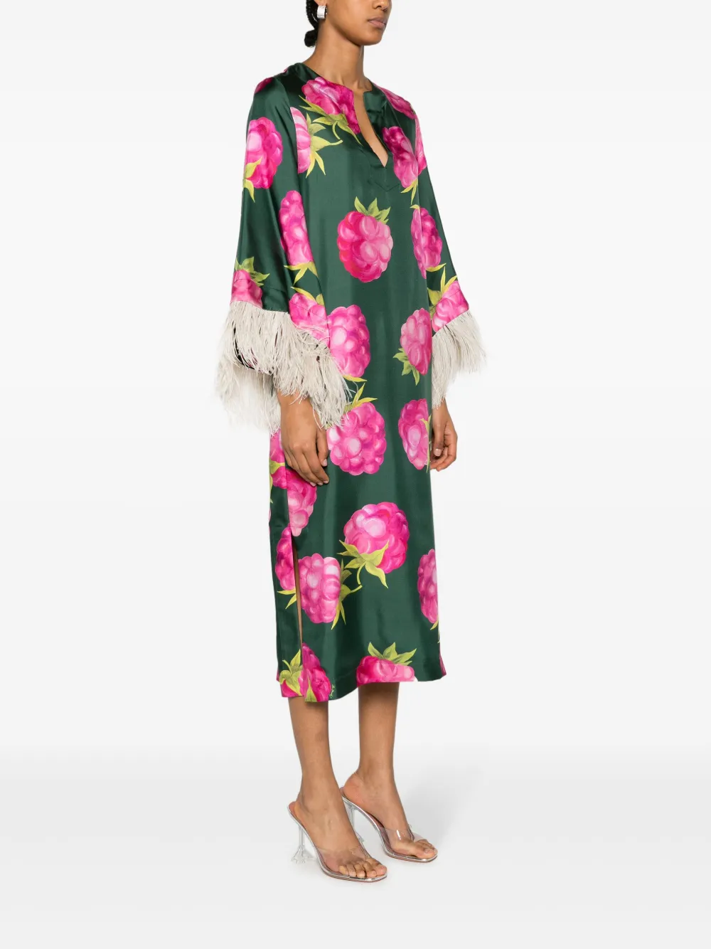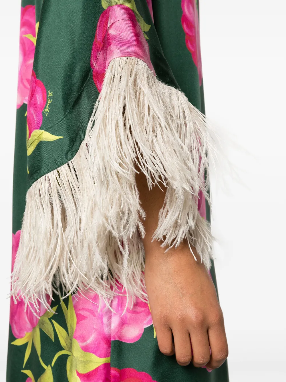 Смесовый шелк, страусиные перья, сплошной графичный принт, вырез с прорезью, рукава три четверти и длина ниже колена.