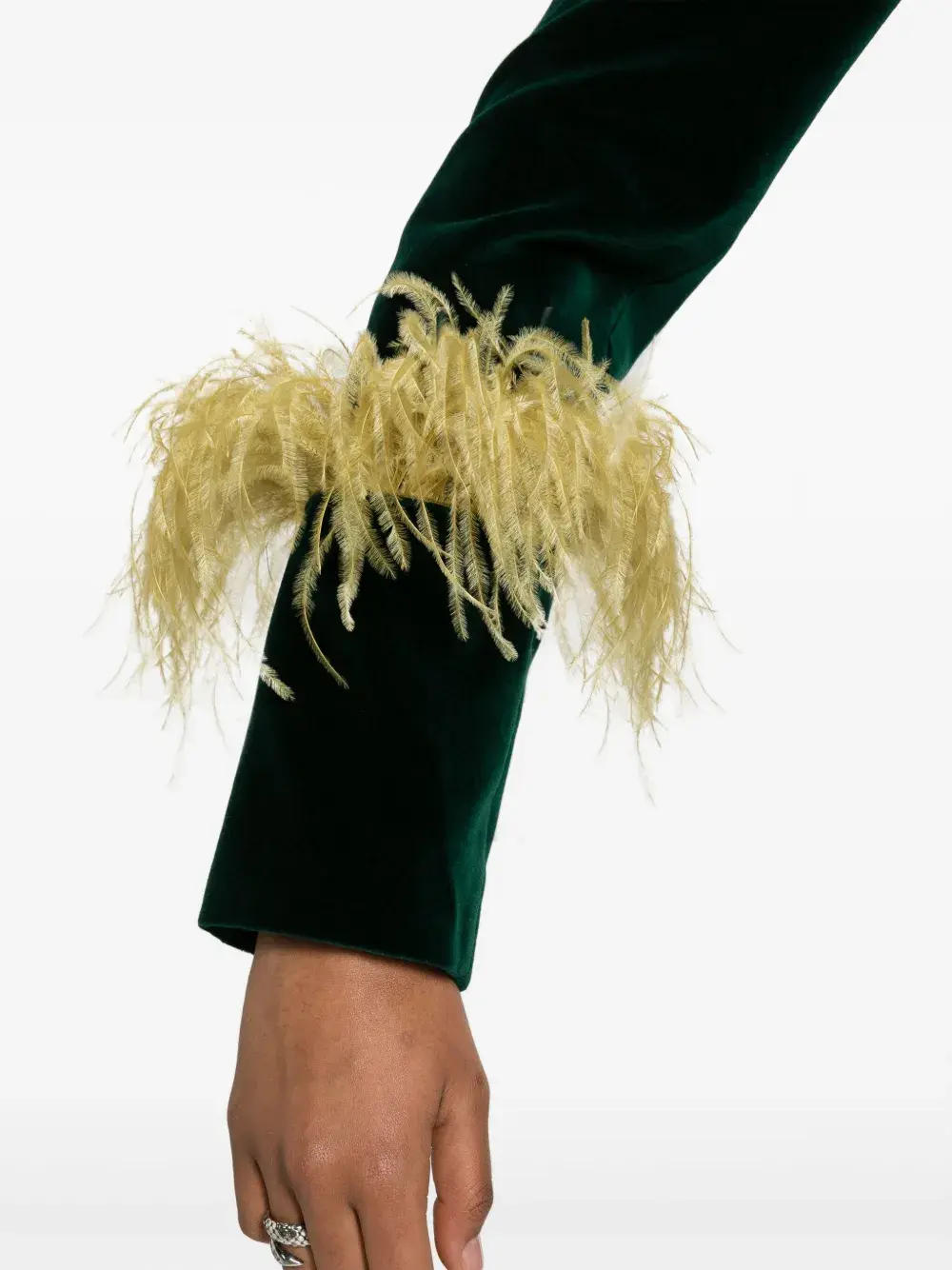 Темно-зеленый, смесовый хлопок, страусиные перья, перья, бархатистое покрытие, зазубренные лацканы, застежка на пуговицах спереди, прорезной карман на груди, передние карманы с клапаном, длинные рукава и прямой подол.