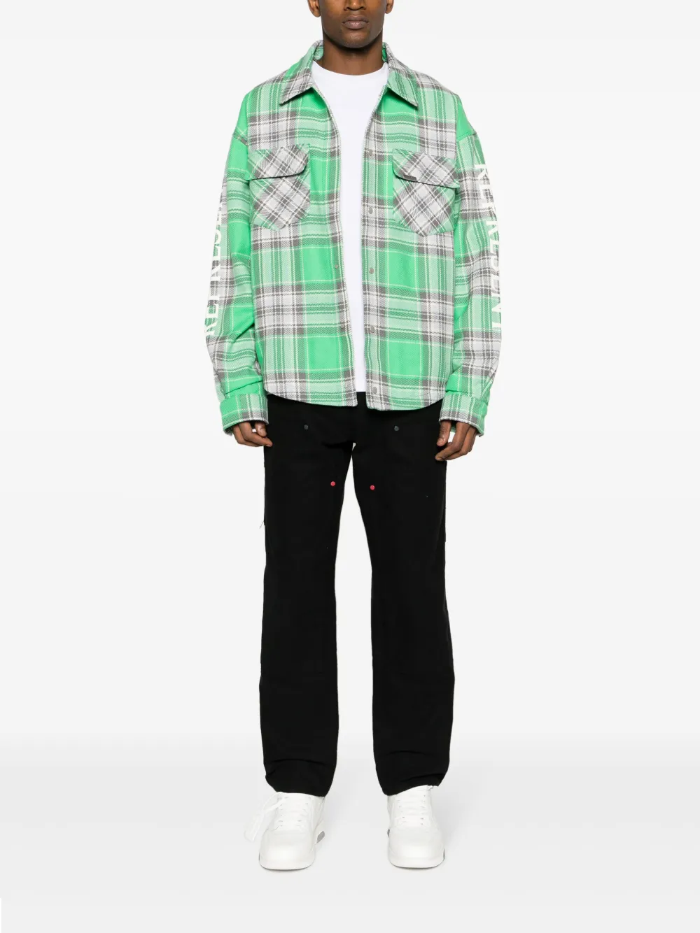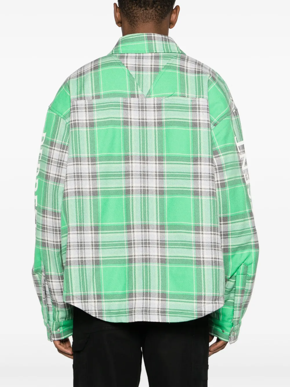 Ярко-зеленый, смесовый хлопок, принт с логотипом на рукаве, фланель, серебристая фурнитура, металлический декор, кокетка, классический воротник, прорезные карманы по бокам, клетчатый узор, два накладных кармана на груди, стеганый материал, закругленный подол и длинные рукава.