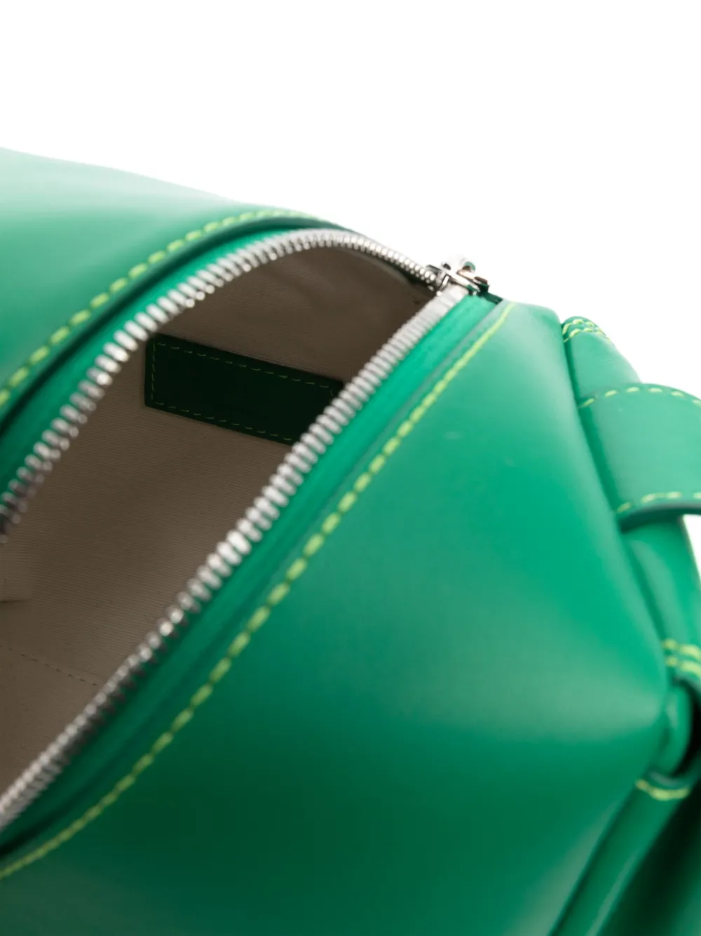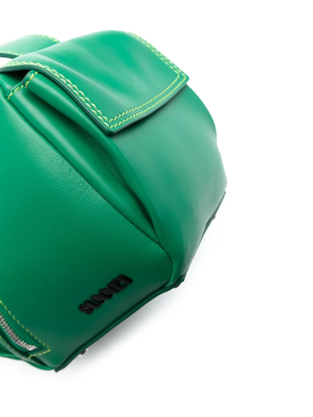 Расцветка Grass Green, телячья кожа, гладкая текстура кожи, логотип, контрастная строчка, смещенная застежка на молнии спереди, регулируемый ремень на плечо, два кармана с клапанами по бокам и основное отделение.