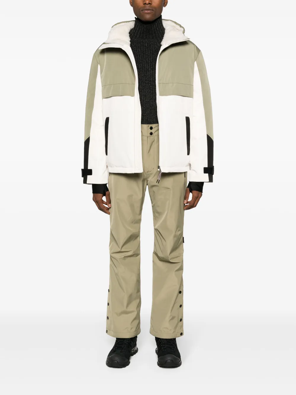 Песочно-бежевый, черный, сочетание двух оттенков, ремешки с логотипом, эластичные резинки, застежка на кнопках спереди, завязки по бокам, два кармана на молнии по бокам и прямой крой.