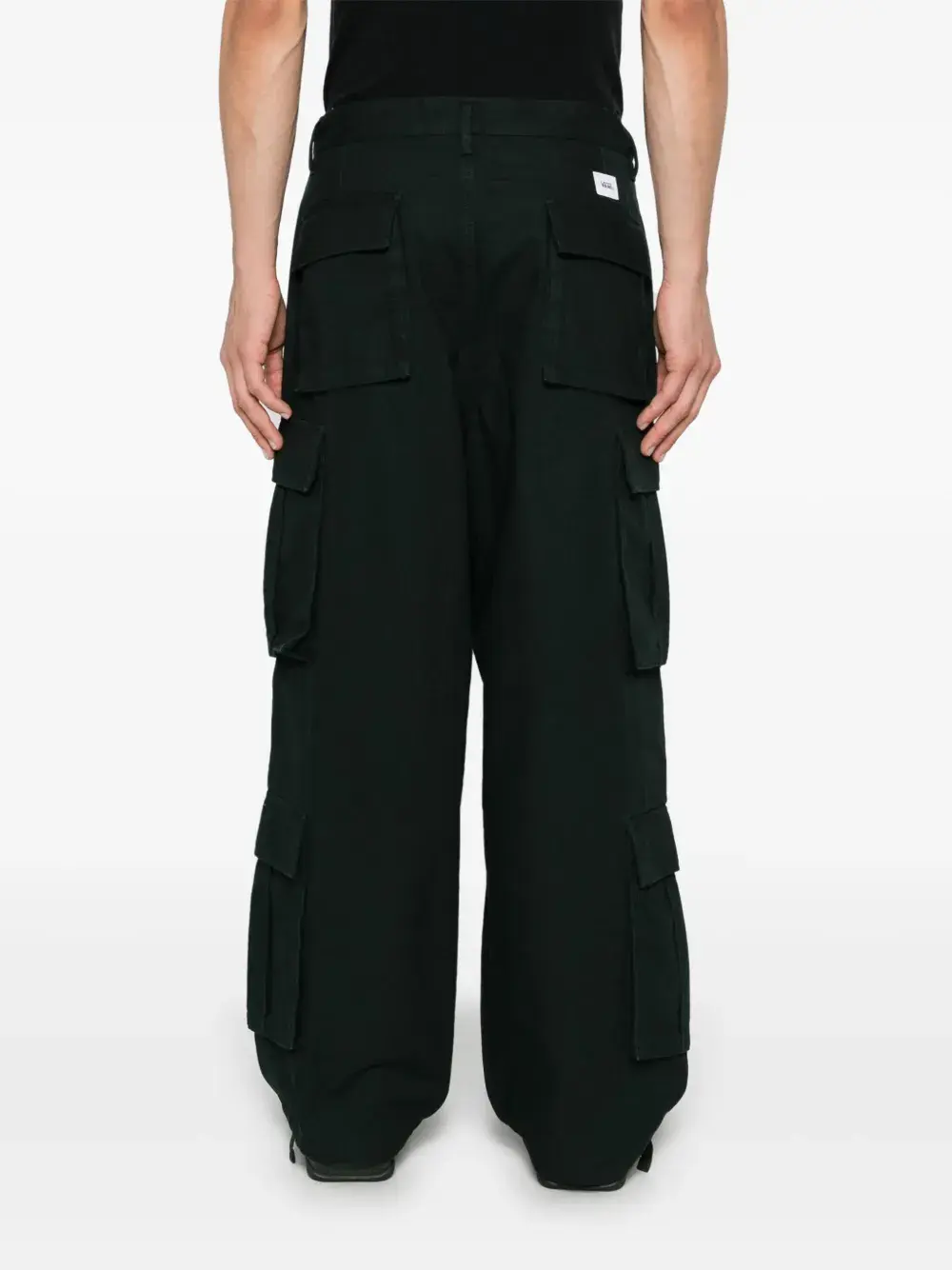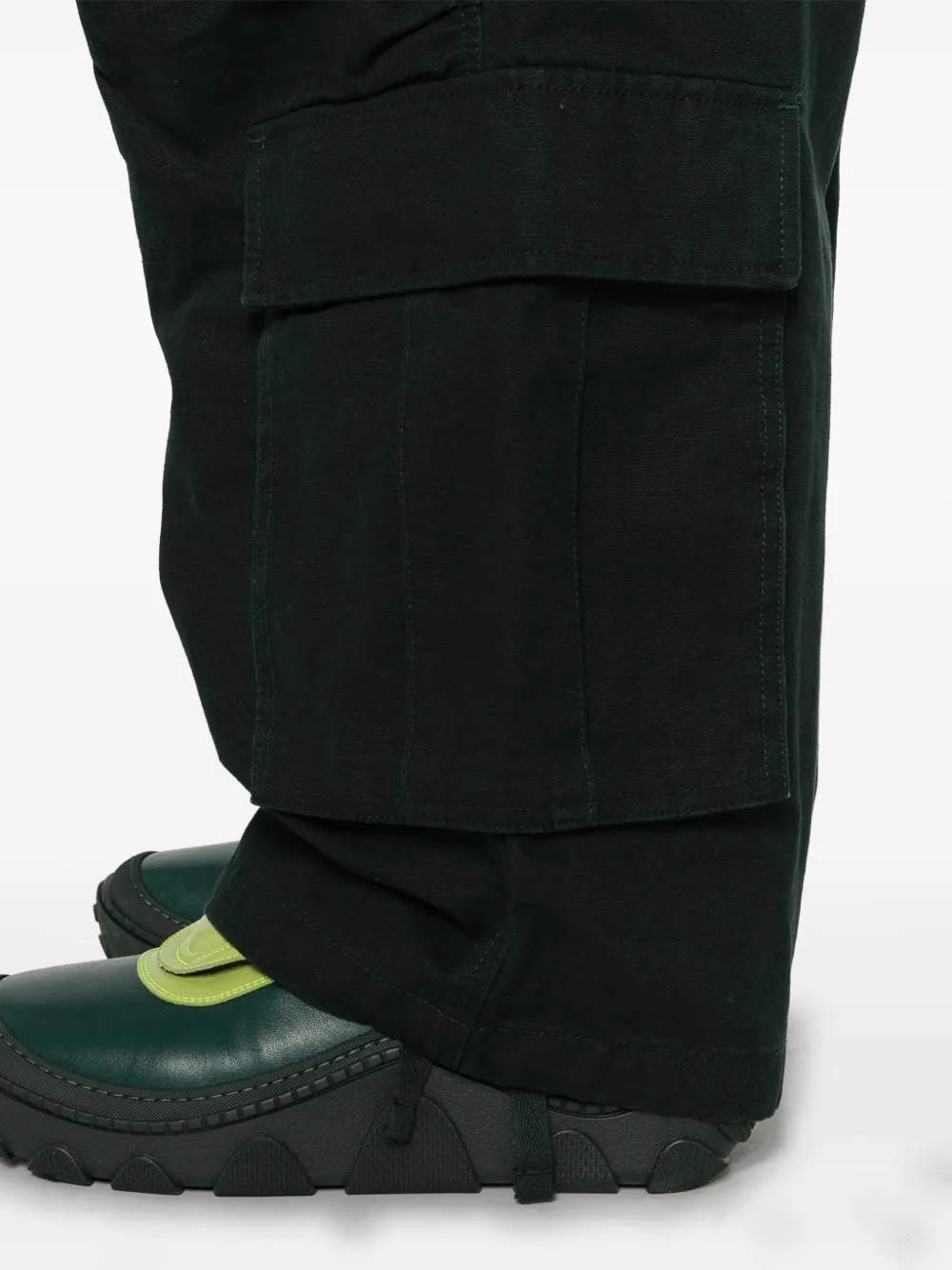 Подробнее о товаре: • темно-зеленый • хлопок • канвас • потайная застежка на молнии и пуговицах • эластичный пояс на шнурке • петли для ремня • два кармана с клапанами по бокам • накладные карманы • два накладных кармана сзади • нашивка с логотипом сзади • манжеты с кулиской • прямой крой • Это унисекс-модель. Обратите внимание, что для нее используется мужская размерная сетка.