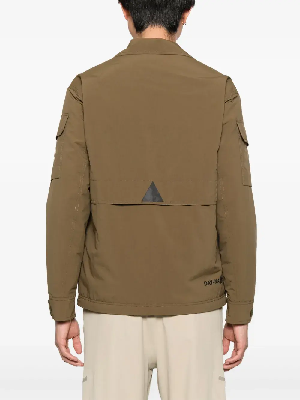 Потайная застежка цвета хаки спереди, два передних кармана с клапанами, два кармана на молнии, длинные рукава